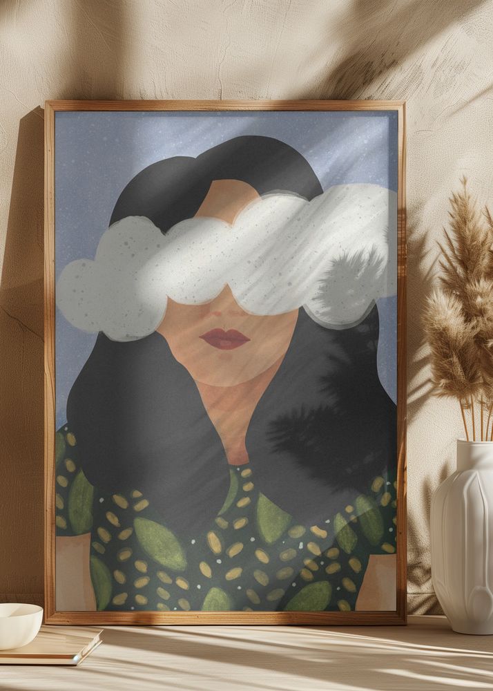 Denna moderna och stilrena poster porträtterar en avskild figur som döljer sina ögon bakom en fluffig molnformation, vilket ger bilden en drömsk och mystisk känsla. Motivet, som framhävs av en texturerad och glittrig himmel i bakgrunden, bjuder in till kontemplation och är en perfekt samtalsstartare. Det är en konstnärlig och trendig print som adderar en unik touch till vilken samtida inredningsstil som helst.