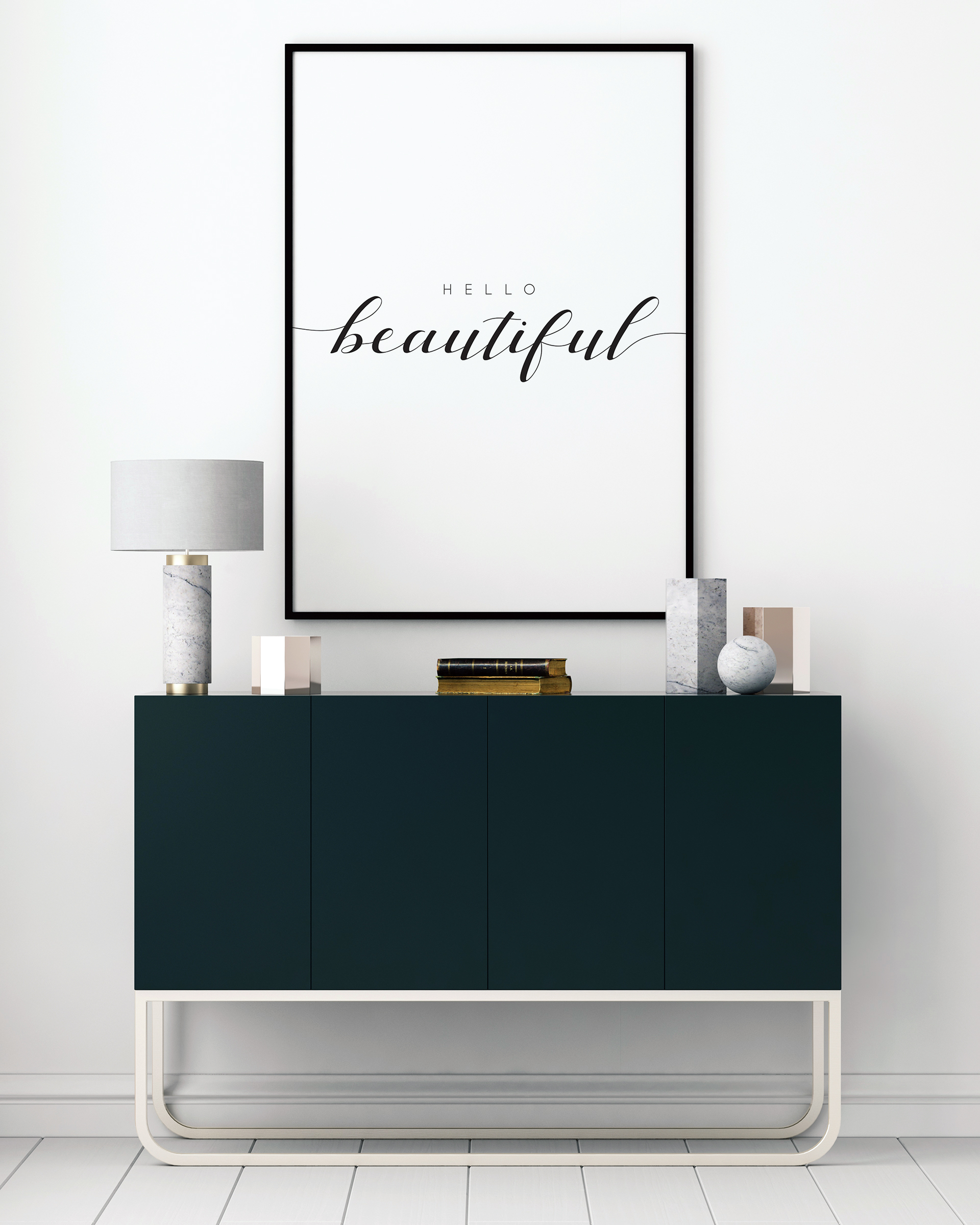 En enkel svartvit poster med två ord placerade i mitten av bilden. Ordet "Hello" står med små versaler, medan ordet "Beautiful" fångar vår uppmärksamhet på grund av sin storlek och de eleganta tecknen. En extremt kraftfull bild att hänga i ett barnrum.