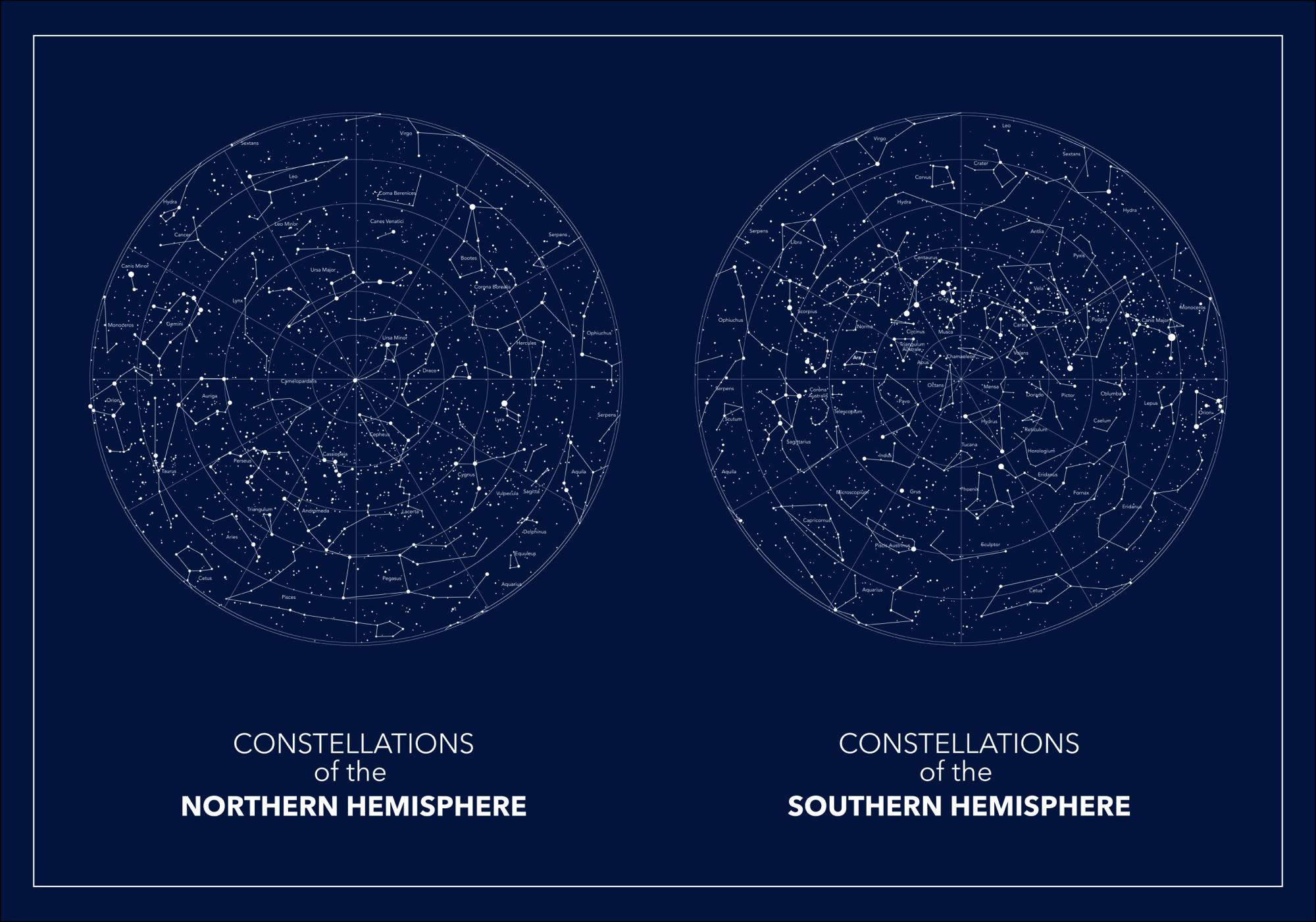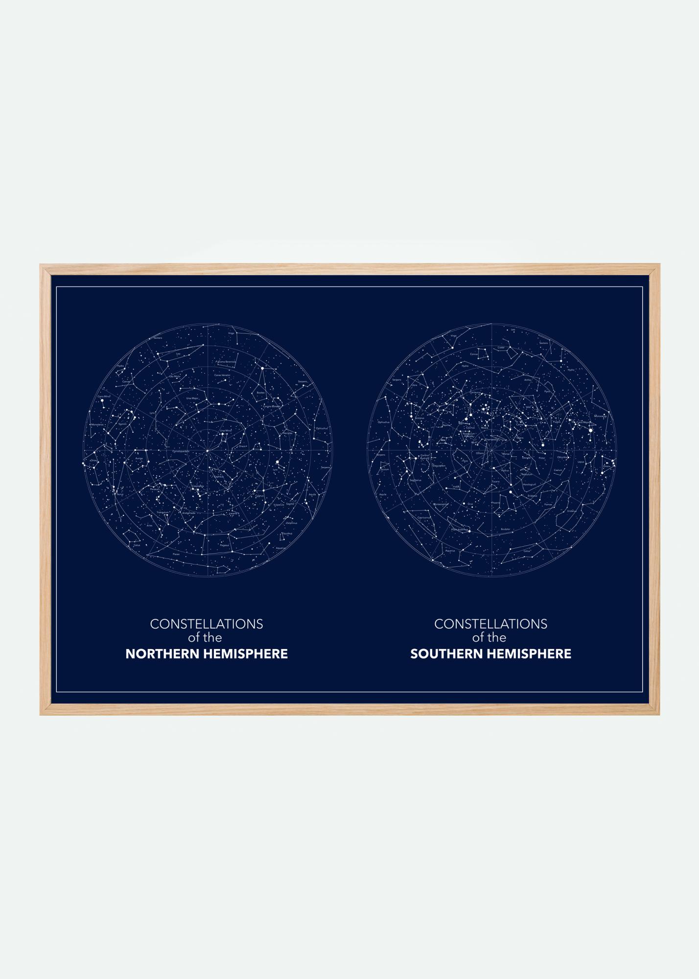 En fascinerande mörkblå poster med den norra och södra stjärnhimlen. Båda bilderna är placerade bredvid varandra. Satta på en mörkblå bakgrund är stjärnbilderna svagt konturerade i vitt. Häng den här bilden i ditt arbetsrum för att skapa en känsla av oändlighet.