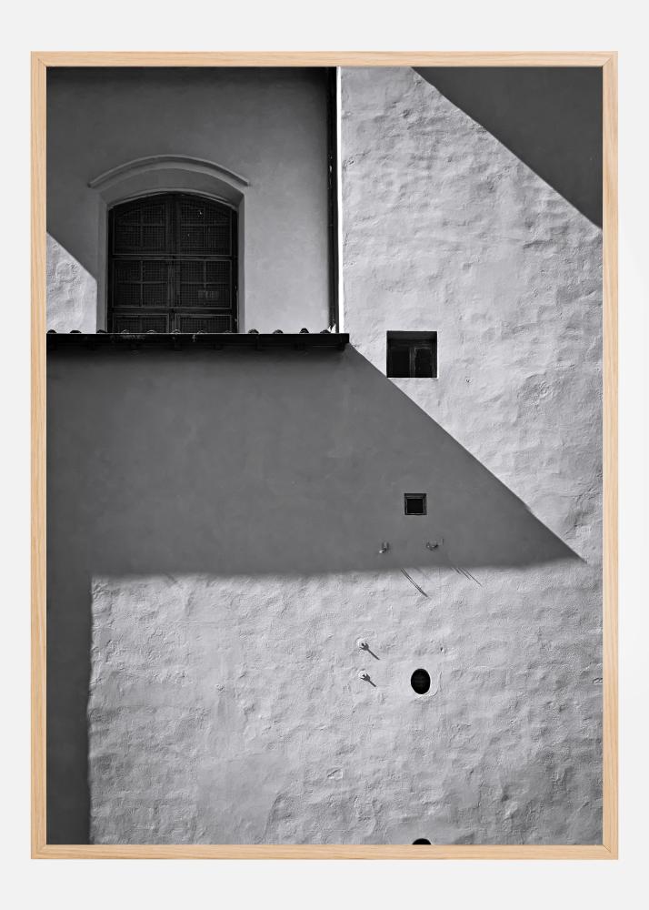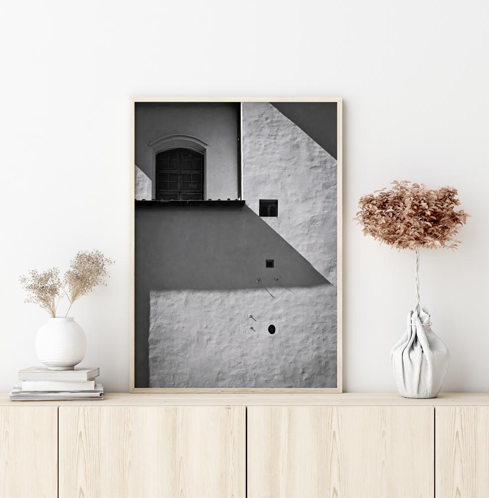 En enkel men vacker svartvit poster med en trädörr i mitten av bilden. Det naturliga solljuset kastar en skugga på väggen. Fyra små hål är placerade under varandra till höger i bilden. Använd din fantasi för att ta reda på vad som finns bakom den stora trädörren.