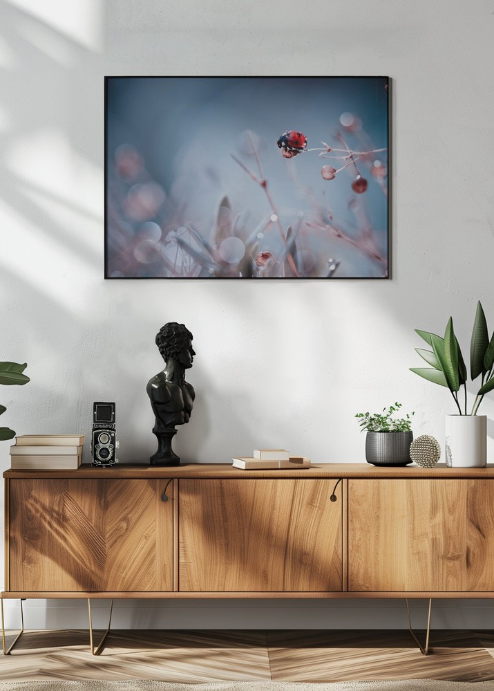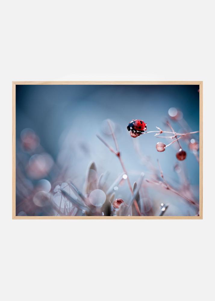 Färgpaletten i detta motiv består av mjuka och harmoniska nyanser av blått och rosa, vilket kompletteras av den röda nyckelpigan. Dessa färger bidrar till en drömlik atmosfär, vilket gör denna affisch till ett utmärkt val för både moderna och klassiska inredningar. Använd denna affisch för att lägga till en subtil men effektfull färgklick i ditt hem.