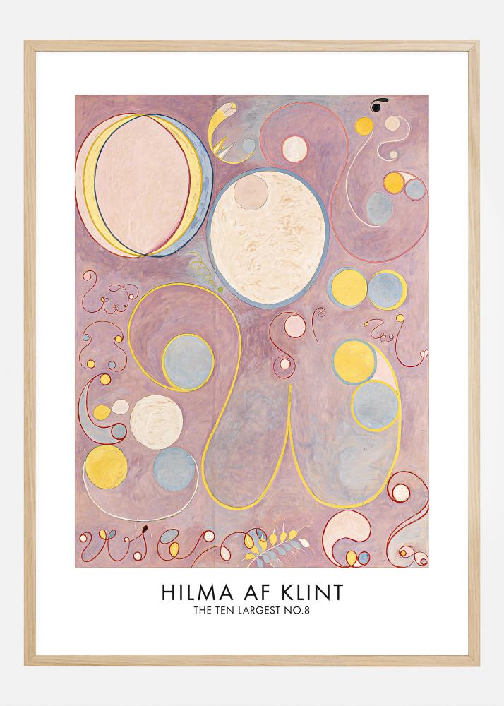 Denna poster visar 'The Ten Largest No.8', en del av Hilma af Klints anmärkningsvärda verk som undersöker andliga dimensioner genom abstrakt konst. Denna delikata komposition använder sig av mjuka pastellfärger och flytande former för att skapa en känsla av harmoni och universell balans. De överlappande cirkelformerna och spiralerna, framhävda av linjer i varmt rött och gult mot en lugnande rosa bakgrund, utstrålar en omslutande lugn och reflektiv atmosfär. Denna print är en fantastisk representation av af Klints djärva och tidlösa vision, och skulle vara ett inspirerande och meditativt tillskott till vilket utrymme som helst.