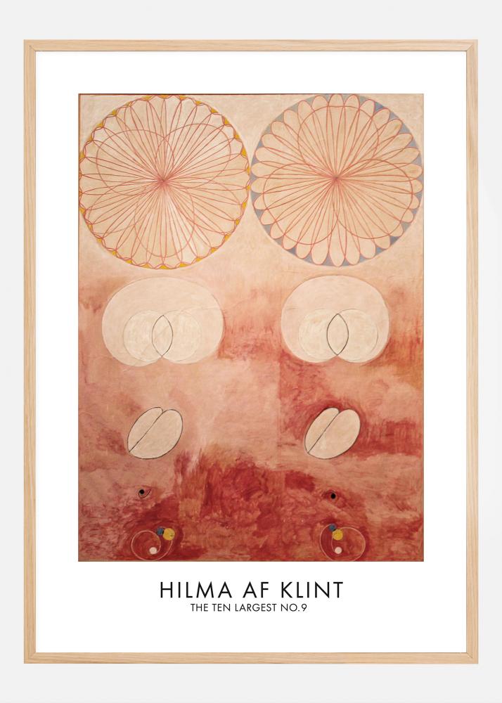 Denna poster av 'The Ten Largest No.9' av Hilma af Klint är en hypnotiserande mix av geometri och organiska former, vilket illustrerar konstnärens fascination för det kosmiska och andliga. De två dominerande cirklarna, fyllda med strålande linjer på en varm rosa och terra-cotta bakgrund, skapar en omedelbar visuell attraktion. Nedanför dessa finns en serie mindre cirklar och spiralformer, som tillför djup och komplexitet till kompositionen. Denna konstprint är en reflektion av af Klints förmåga att förena vetenskap och andlighet i en och samma bildyta, och erbjuder ett öppet fält för betraktarens egna tolkningar och inre utforskningar.