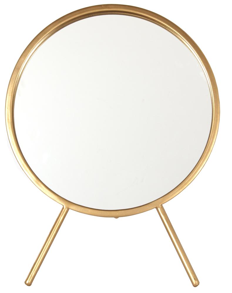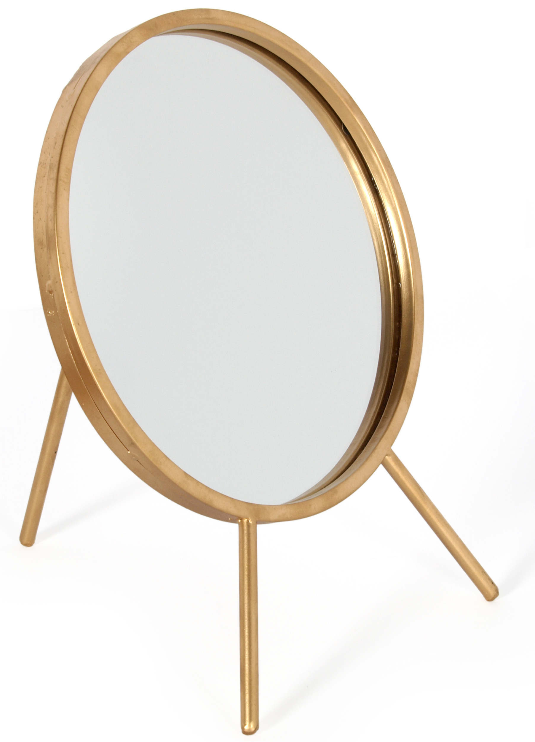 Denna tuffa bordsspegel i dansk design mäter 30 cm i diameter och har en mässingsfärgad ram. Står stabilt, och kommer att utgöra ett snyggt inslag i ditt hem.