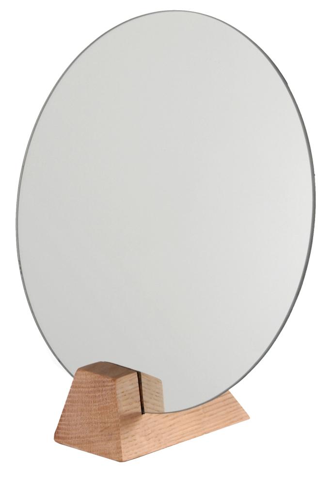 Med sin eleganta design, bordsstöd i ek och ramlösa spegelskiva, kommer den här spegeln att utgöra ett riktigt snyggt inslag i vilket trendmedvetet hem som helst. Den mäter 30 cm i diameter, och finns även med svart bordsstöd.
