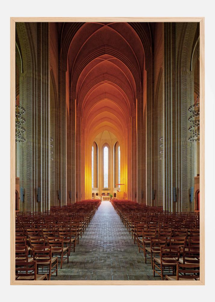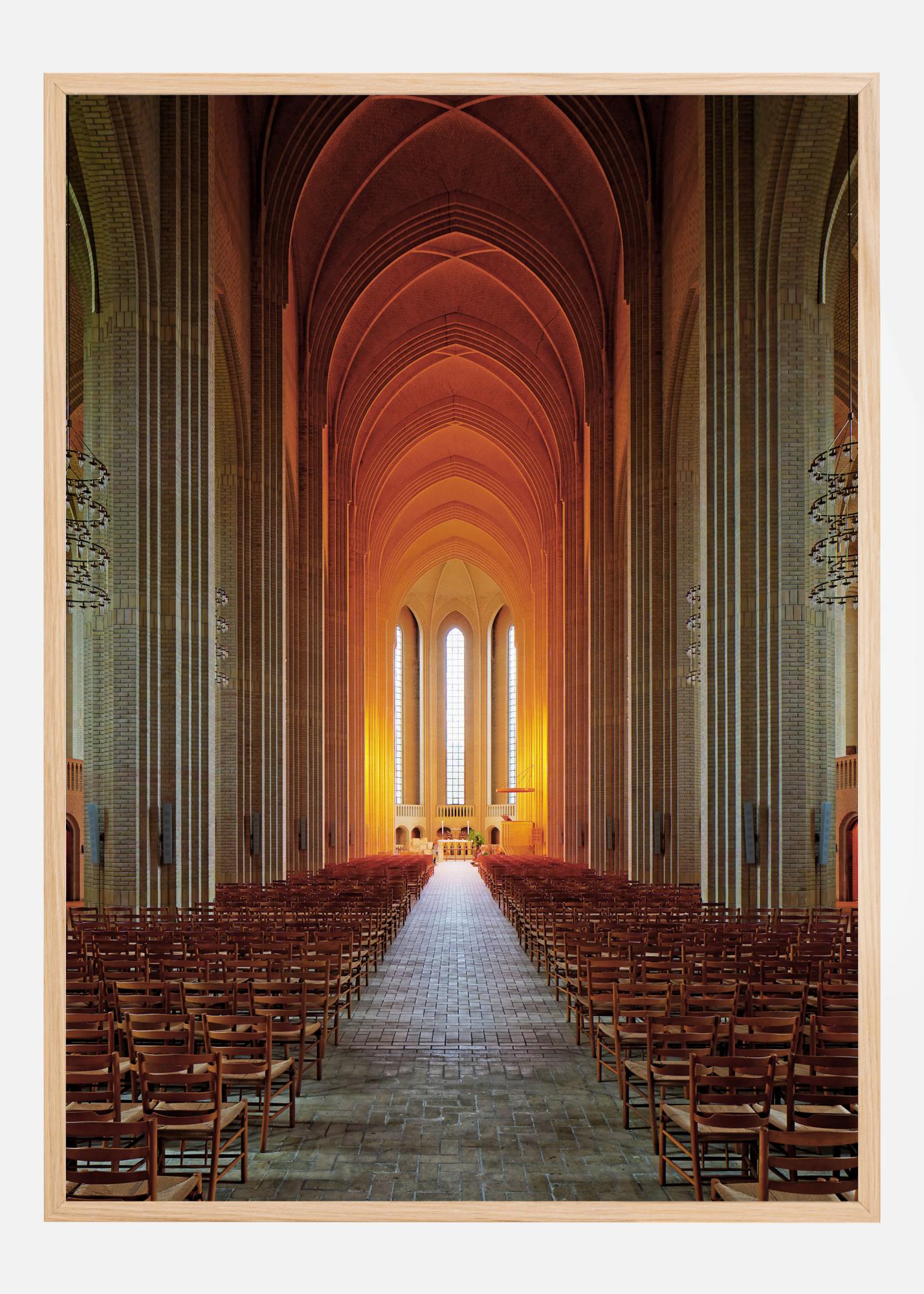 En hisnande arkitektonisk poster inne i en kyrka. Den långa kyrkgången leder fram till altaret och det höga taket samt stenkolonnerna ger en mycket fridfull känsla. Orangefärgat ljus reflekteras genom fönstren och skapar en känsla av värme och harmoni. Upplev lugnet i den här bilden.