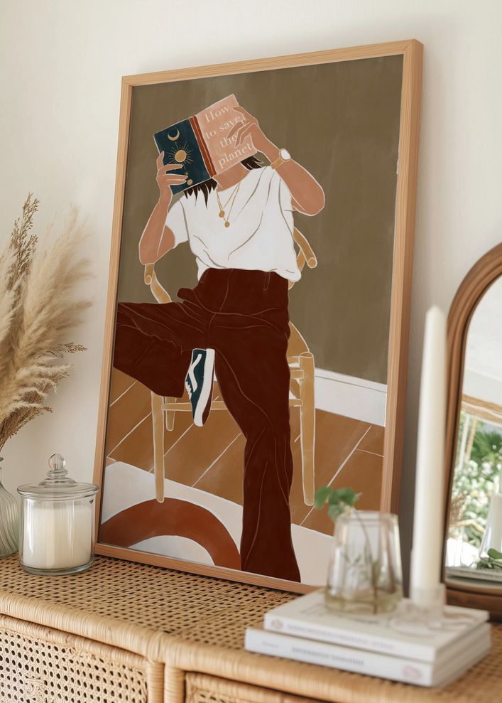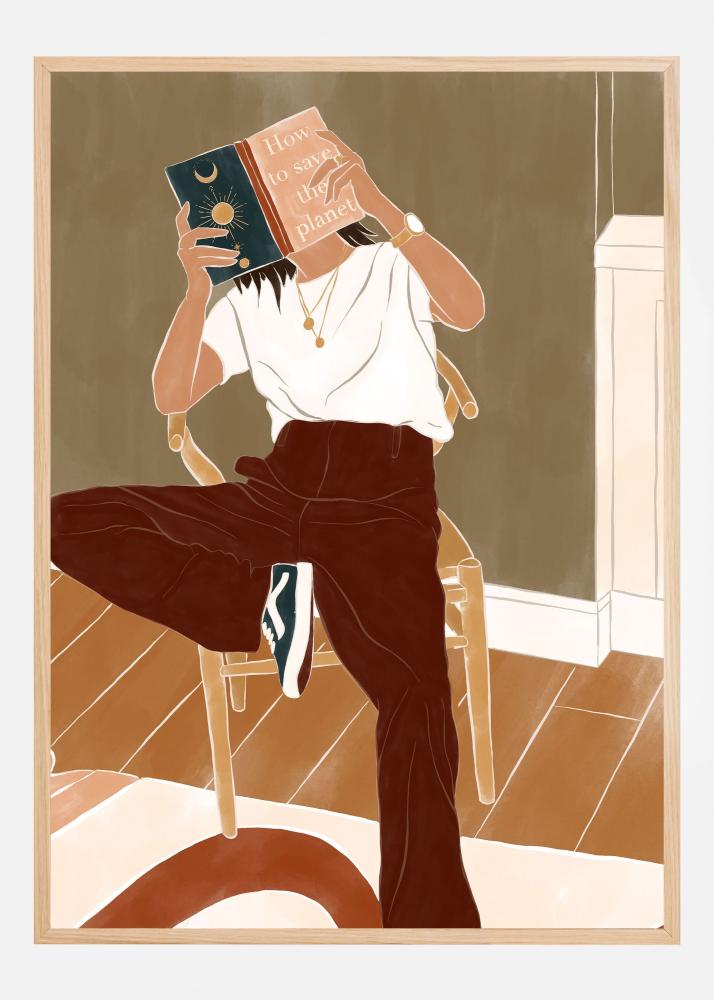 Denna trendiga poster fångar ett ögonblick av avkoppling och reflektion, där en person sitter bekvämt med en bok framför ansiktet. Bokens omslag, med texten "How to Save the Planet", uppmuntrar till eftertanke och kan inspirera till ett hållbart tänkesätt. Motivet är perfekt för dem som söker en stilren affisch med ett djupare budskap. De distinkta kontrasterna mellan färgerna lyfter fram designens moderna känsla.