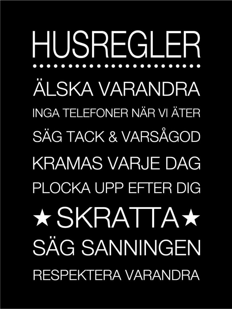 Grafiskt tryck med kanske för många familjer självklara husregler, som det ändå inte skadar att påminnas om ibland. Affischen har en svart bakgrund med ett sobert vitt typsnitt och den passar in i alla typer av rum i hemmet. Illustrationen är även en uppskattad gå-bort-present eller varför inte ge den som bröllopsgåva för att brudparet ska få en harmoniskt start på sitt nya liv tillsammans.