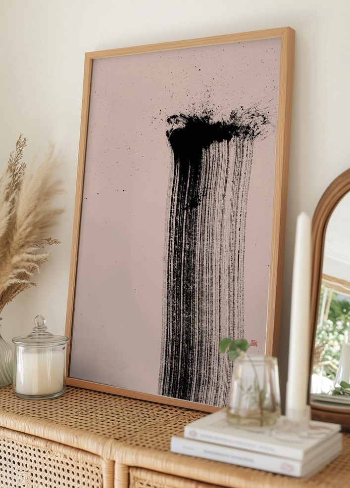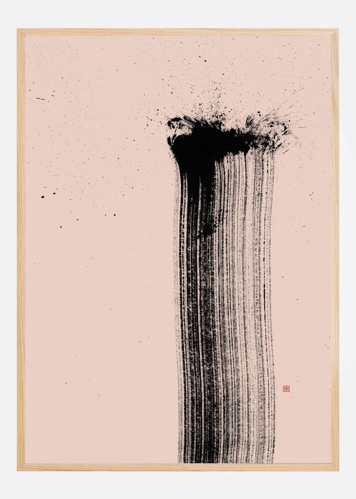 Denna poster erbjuder ett stilrent och modernt motiv med ett dramatiskt svart penseldrag som reser sig mot en mjukt rosa bakgrund. Kontrasten mellan det djärva svarta och den ljusa rosa skapar en visuell balans som passar perfekt i ett samtida hem. Den subtila texturen i penseldraget ger en känsla av rörelse och dynamik som fångar blicken och håller den kvar. Detta print är idealiskt för den som vill lägga till en konstnärlig och modern touch till sitt rum.