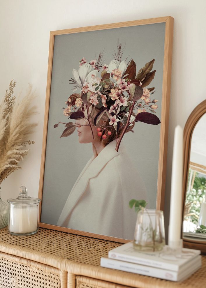 Denna unika poster förenar naturens skönhet med stilren estetik genom en kreativ komposition där blommor och växtlighet smälter samman med en kvinnas profil. Fotot utstrålar en känsla av lugn och mystik, vilket gör det perfekt för att skapa en elegant atmosfär i vilket rum som helst. Affischen fångar ögat med sin ovanliga blandning av naturliga element och konstnärliga uttryck.