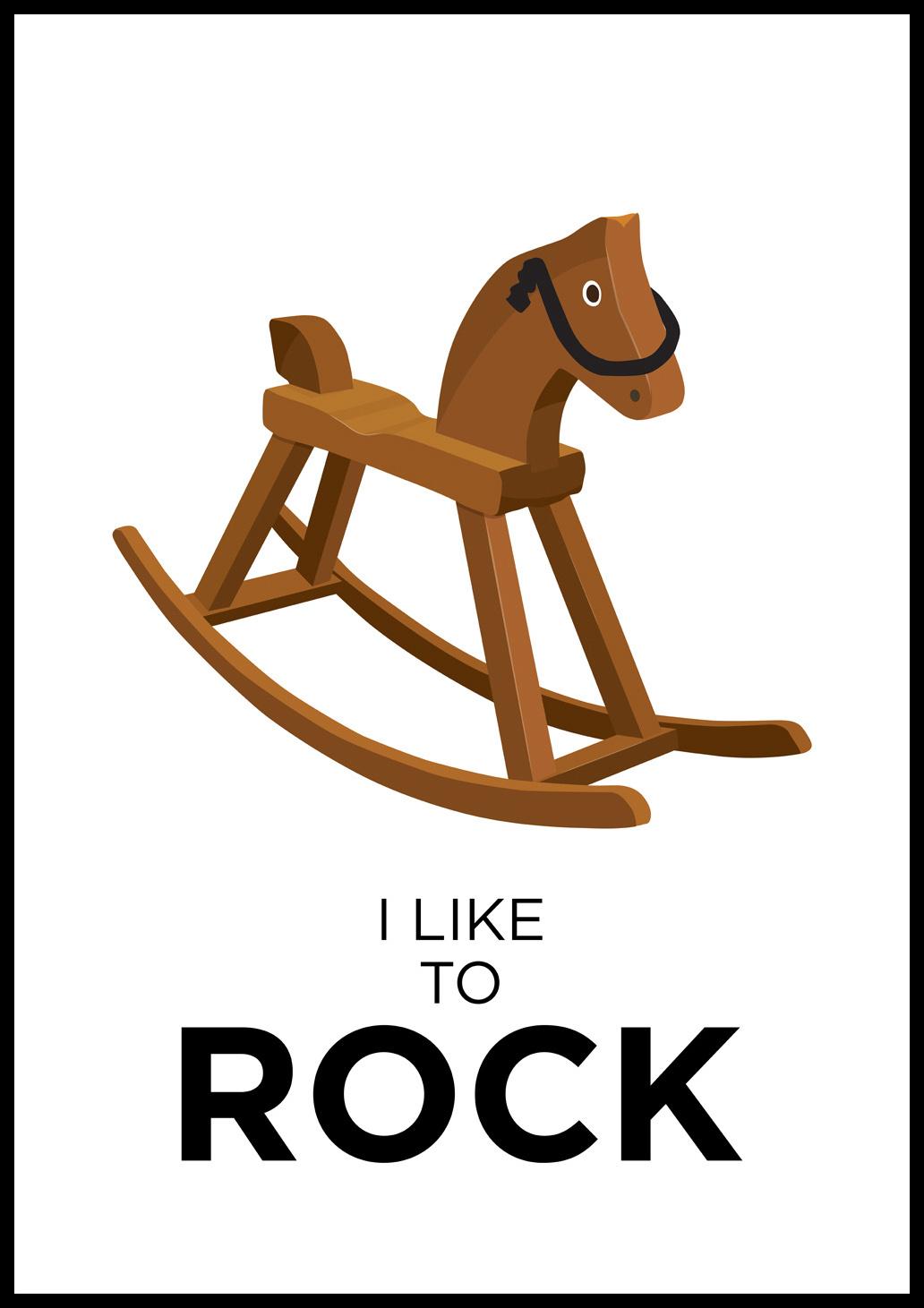 Rolig barnposter med en stilig gunghäst och budskapet - I like to rock. Det humoristiska trycket passar lika bra i barnkammaren hos den lilla rockern, som att ge i present till den övervintrade hårdrockaren som borde klippa sig och skaffa ett jobb. Den stilrena postern blir snygg att rama in i en snygg svart tavelram som plockar upp färgen i typsnittet och ger tavlan en rockig känsla, gärna tillsammans med andra grafiska tryck på en tavelvägg med ett spännande tema.
