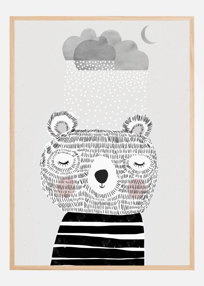 Motivet är framförallt gestaltat i en lugnande palett av grånyanser med subtila inslag av vitt och svart, vilket bidrar till dess tidlösa utseende. En mild regnmolnsfigur med stiliserade regndroppar och en tunn halvmåne pryder bakgrunden, och lägger till en drömsk dimension till denna vackra affisch. Den här trycksaken är idealisk för dig som vill ha en konstnärlig touch i ditt hem samtidigt som du håller saker estetiskt nedtonade och sofistikerade. Svarta ränder på björnens tröja ger designen djup medan den hjärtformade näsan tillför en söt och vänlig karaktär.
