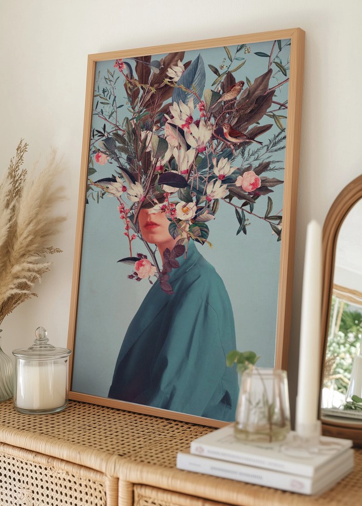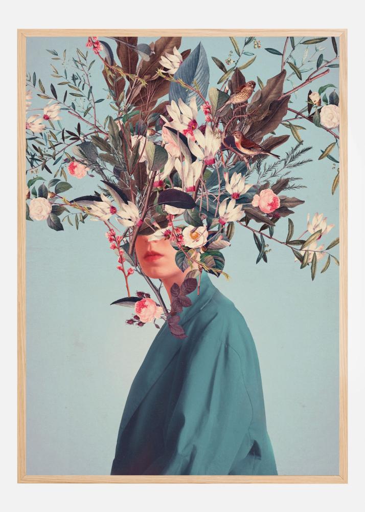 Denna unika poster fångar ögat med ett kreativt och surrealistiskt motiv, där en person i en blågrön kappa är delvis täckt av en explosion av blommor och lövverk. Det är en harmonisk kombination av människa och natur, vilket skapar en drömlik atmosfär. Perfekt för dig som söker en konstnärlig print som väcker nyfikenhet och inspiration på väggen.