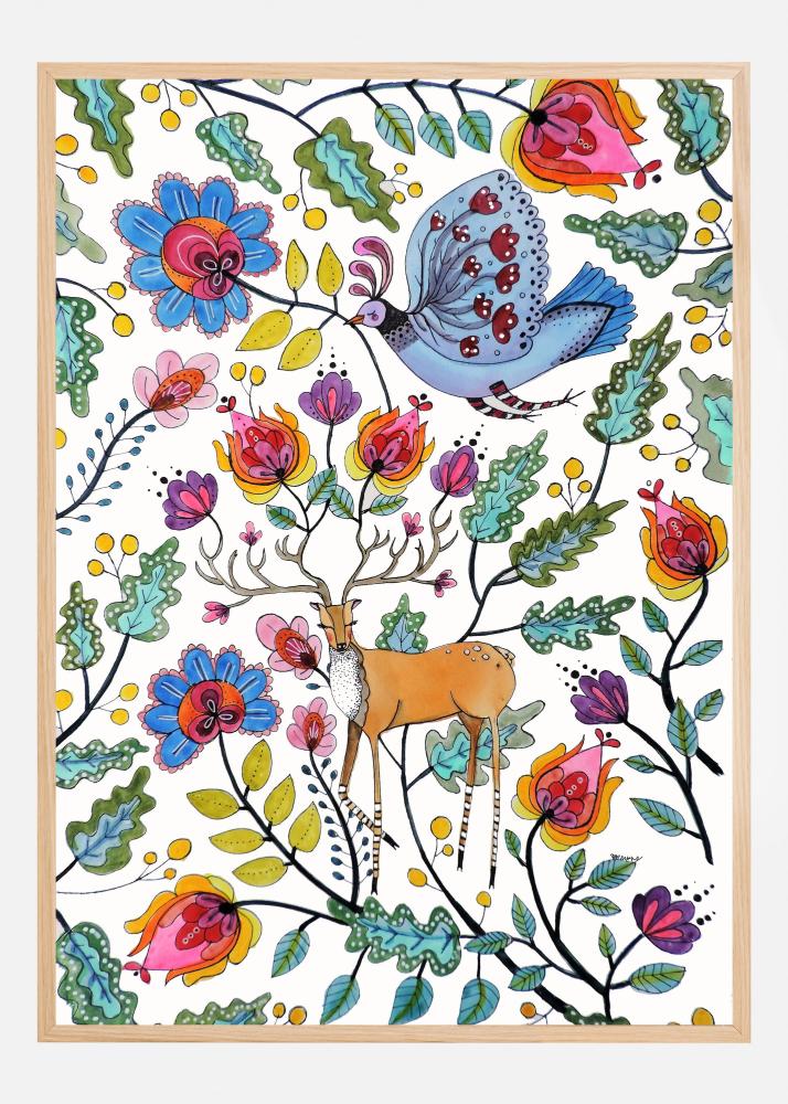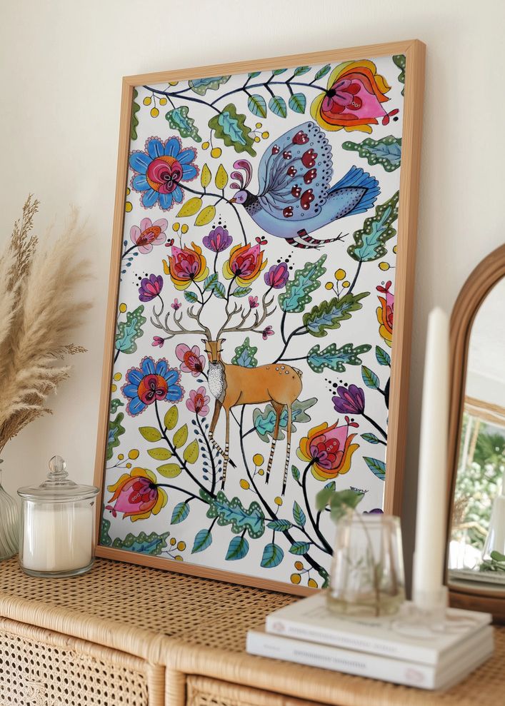 Denna livfulla poster fångar naturens magi med ett färgglatt motiv av blommande blommor och ett elegant rådjur. Dekorerad med en skatt av detaljer, såsom en praktfull blå fjäril och bladverk, framkallar denna affisch en känsla av lekfullhet och harmoni. Blommorna breder ut sig i nyanser av rosa, rött, gult och blått, vilket ger en rik färgpalett som drar ögat och väcker rummet till liv.