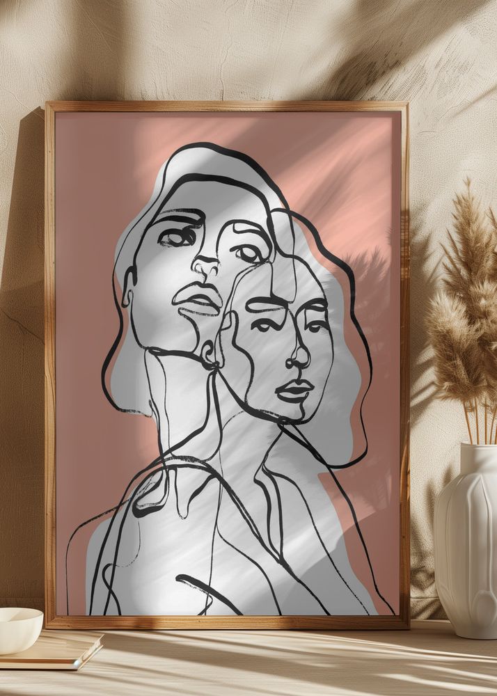 Denna moderna och stilrena poster framställer en abstrakt linjekonst som avbildar flera ansikten sammanflätade i en enkel svart kontur mot en mjukt rosa bakgrund. Deep Switch designen lämpar sig väl för den som uppskattar minimalistisk konst med en samtida beröring. Den rena kompositionen i denna print gör den till ett elegant tillskott i varje rum, från sovrum till vardagsrum eller kontor.
