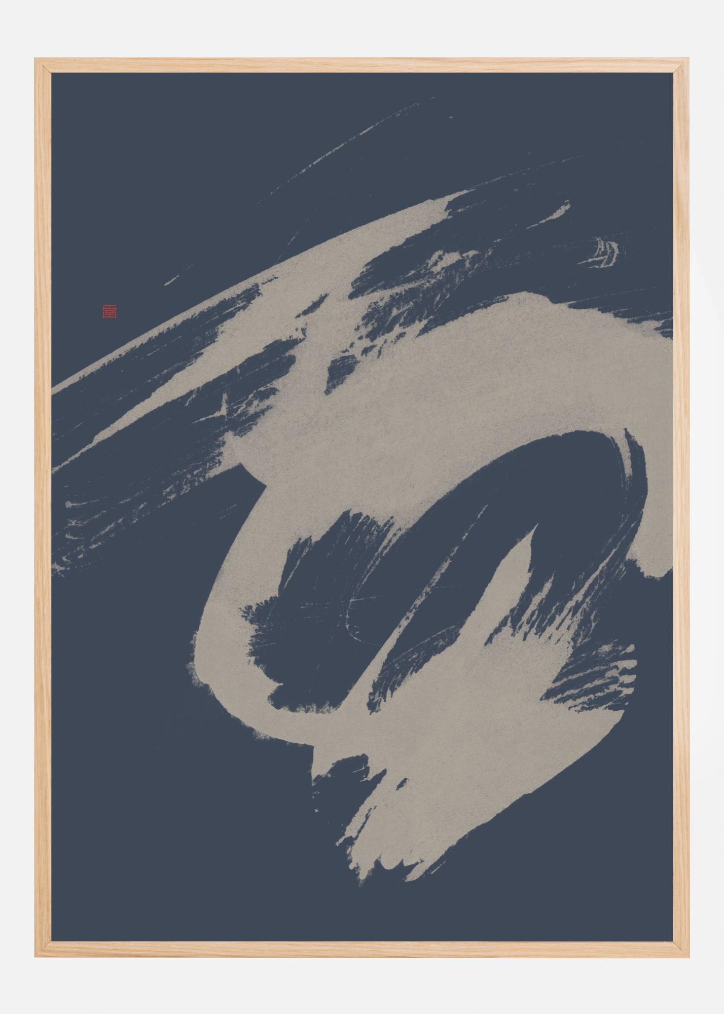 Denna stilfulla poster visar ett abstrakt motiv med svepande penseldrag som ger en känsla av rörelse och dynamik. Den djupa midnattsblå bakgrunden kontrasterar vackert mot de ljusare grå nyanserna, vilket skapar en harmonisk och modern känsla. Perfekt som ett tryck för att ge liv åt vilket rum som helst, oavsett om det är en del av ett gallerivägg eller en solitär affisch.