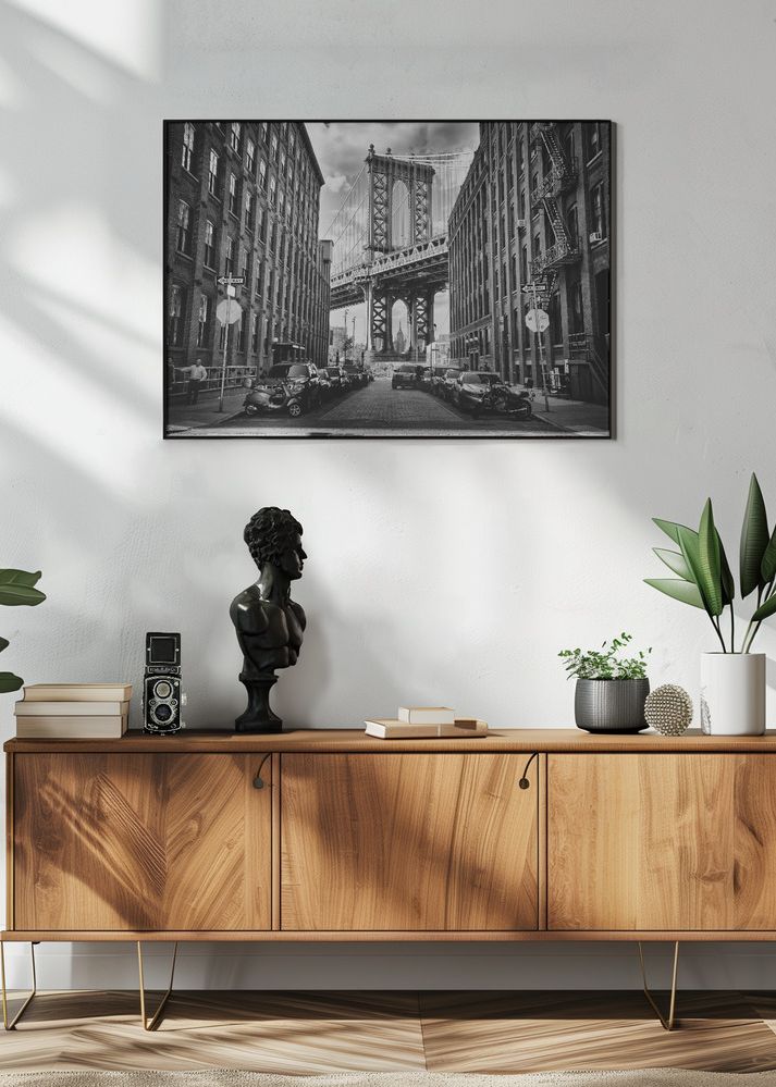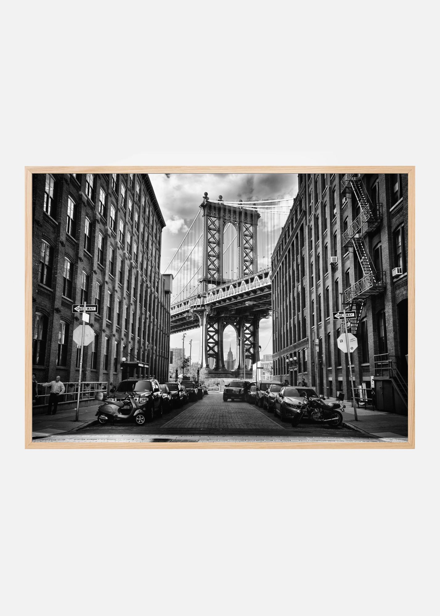 Denna poster fångar den ikoniska vyn av en bro som sträcker sig majestätiskt mellan två rader av klassiska, urbana byggnader. Den svartvita färgpaletten förstärker affischens tidlösa och eleganta känsla, vilket gör den perfekt för moderna och stilrena interiörer. Bildens dramatiska komposition med den centrala brostrukturen skapar ett visuellt djup som drar betraktarens blick inåt.