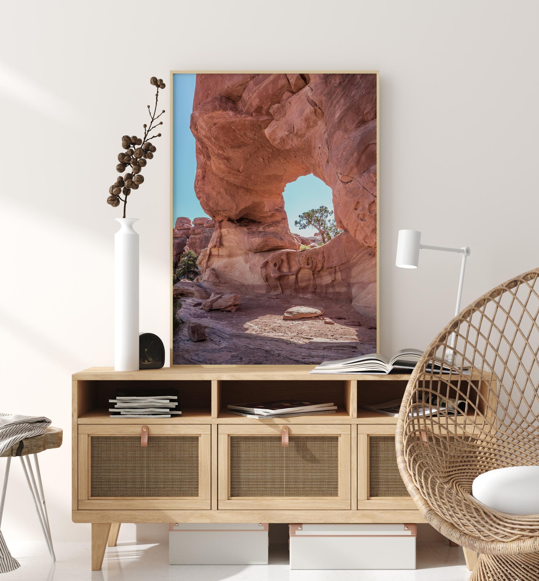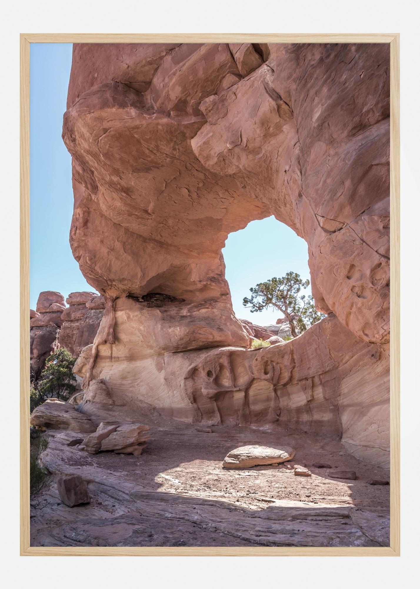 En imponerande naturposter av en orangefärgad sten med ett hål i mitten. Ett litet träd dyker upp på andra sidan hålet. Solen skiner genom hålet i klippan och skapar ett skuggat område framför klippan. De vackra starka färgerna är perfekta för att lysa upp ett tråkigt rum.