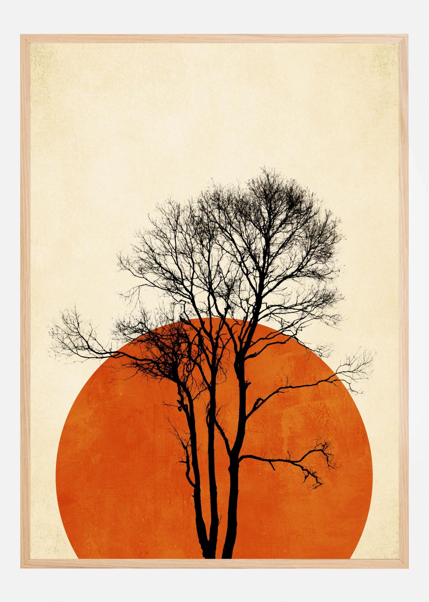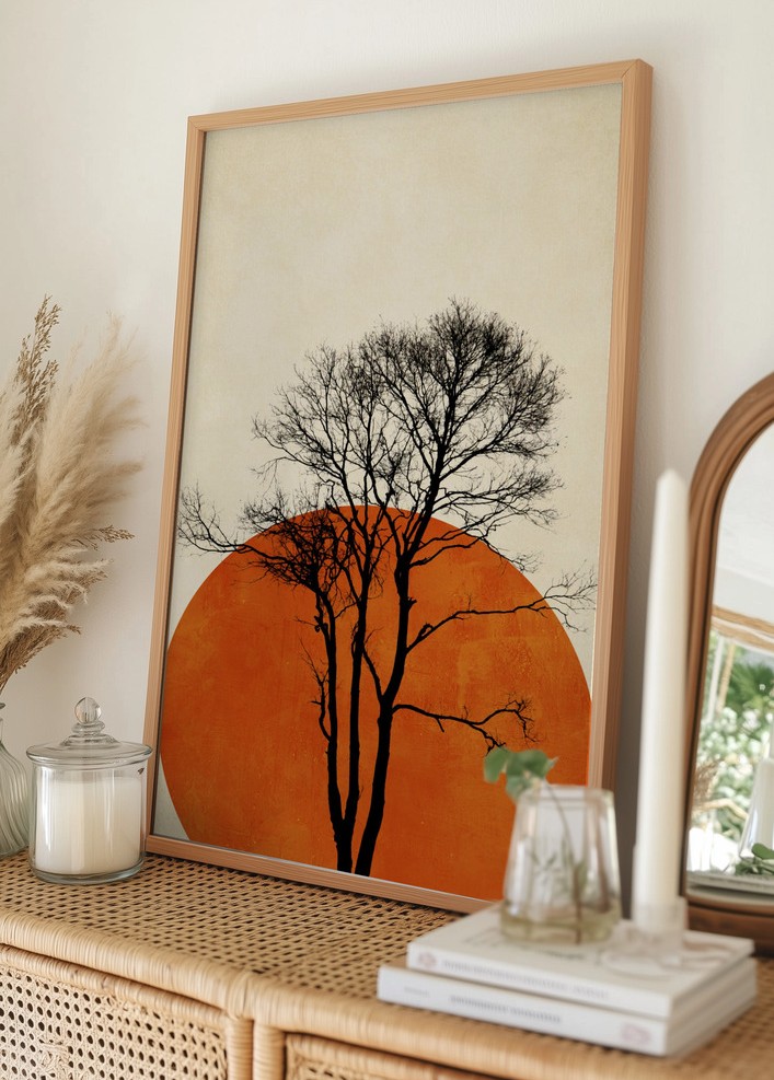 Upptäck en stilren poster som kombinerar naturens skönhet med minimalistisk design. Denna affisch föreställer en vacker silhuett av ett träd, vars tunna grenar sträcker sig över en stor, varm orange cirkel. Det kontrasterande svarta och orangea ger motivet ett modernistiskt utseende som lätt kan komplettera olika inredningsstilar. Perfekt som print för den som älskar både konst och natur.