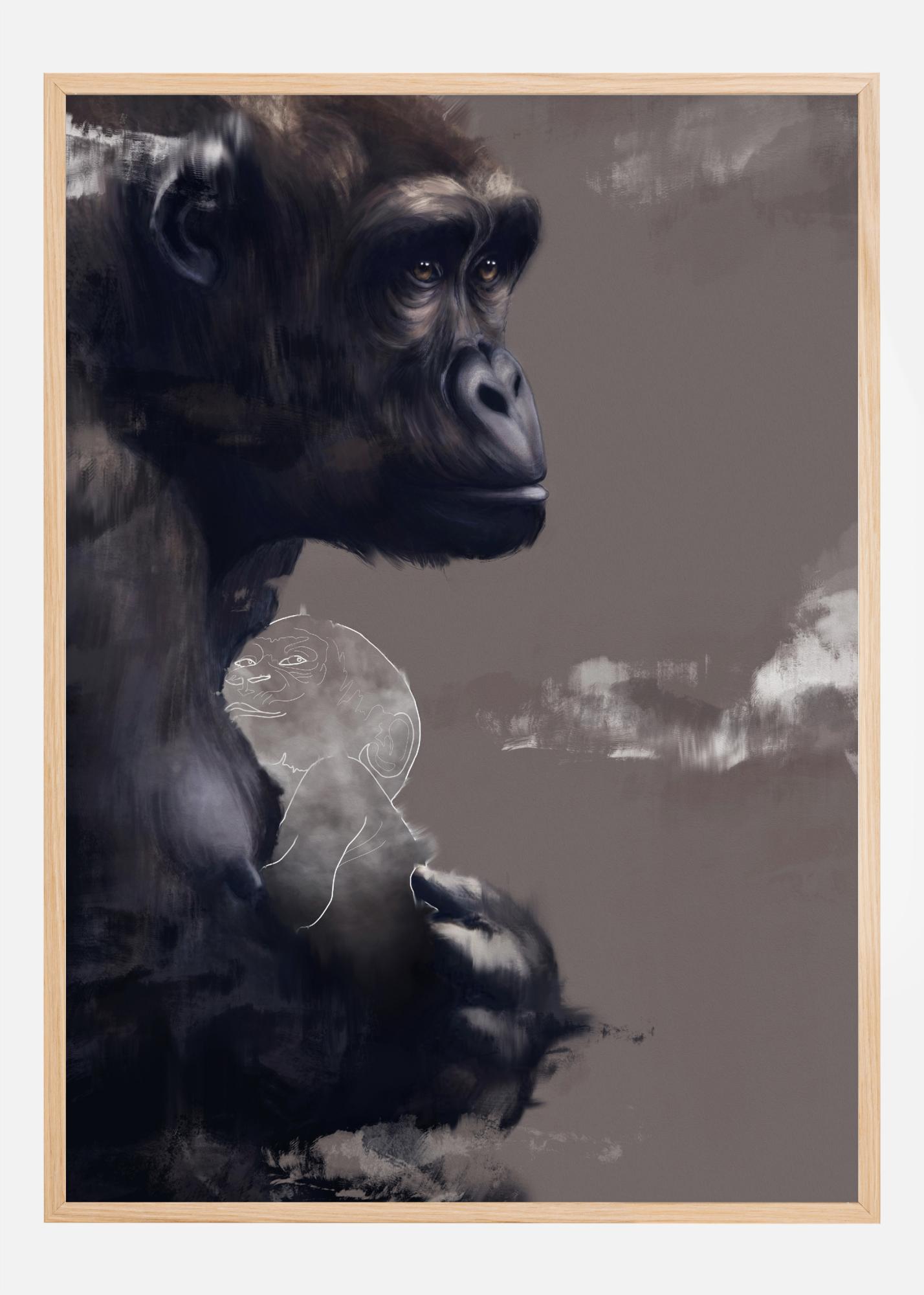 Ett slående naturposter med en gorilla som håller sitt nyfödda barn. Mot en ljusbrun bakgrund visar den här kraftiga primaten en kraftfull men ändå mild modersinstinkt. Den här bilden av en gorilla som skyddar det nyfödda barnet i sina kärleksfulla armar är ett perfekt tryck för alla djurälskare.