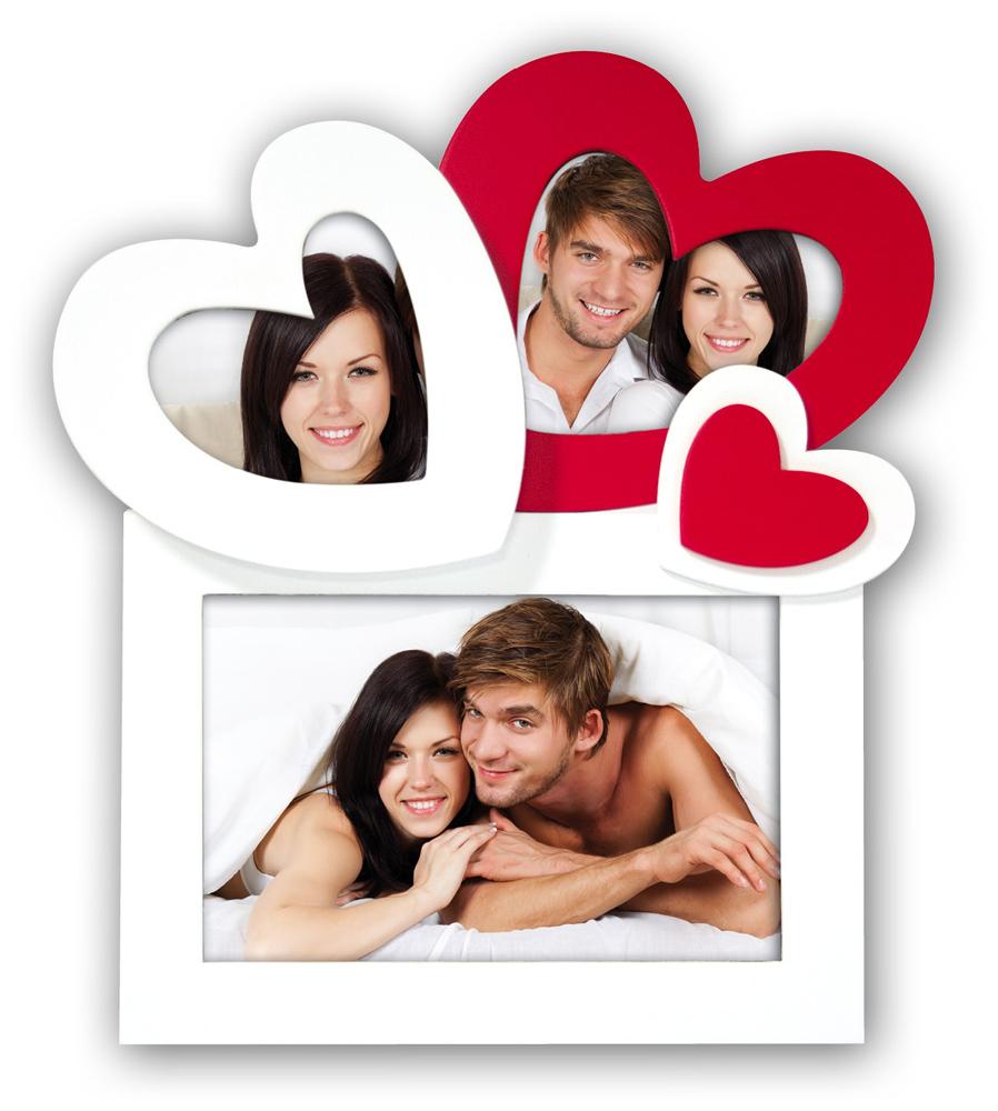 Ingrid är en vit och röd collageram där två av bilderna är hjärtformade. Passar lika bra i bokhyllan som på väggen i sovrummet.