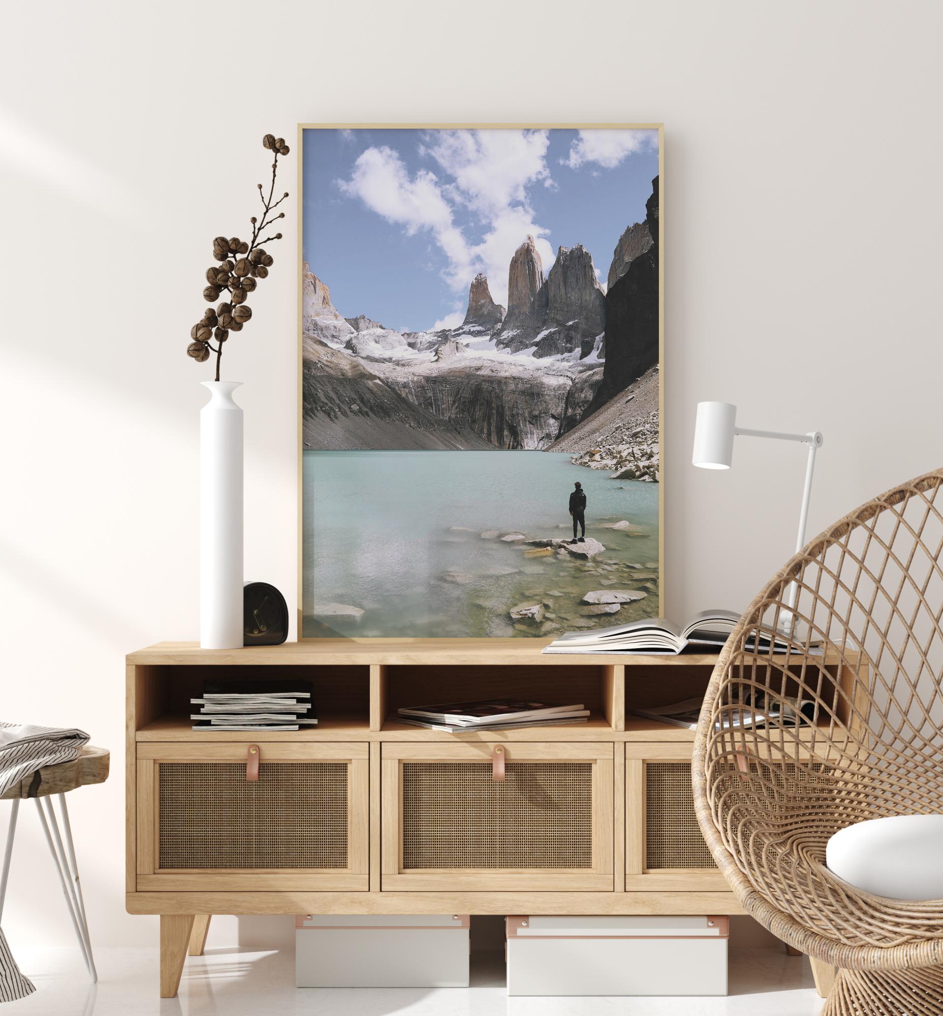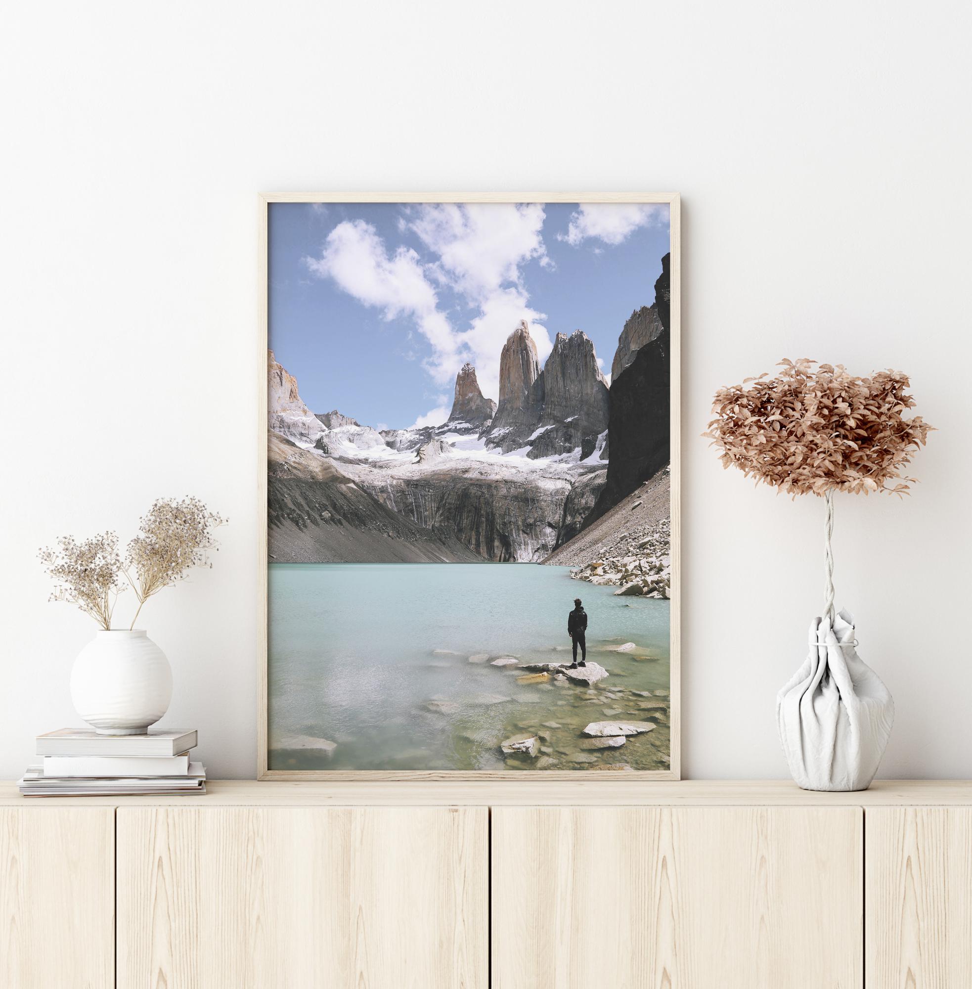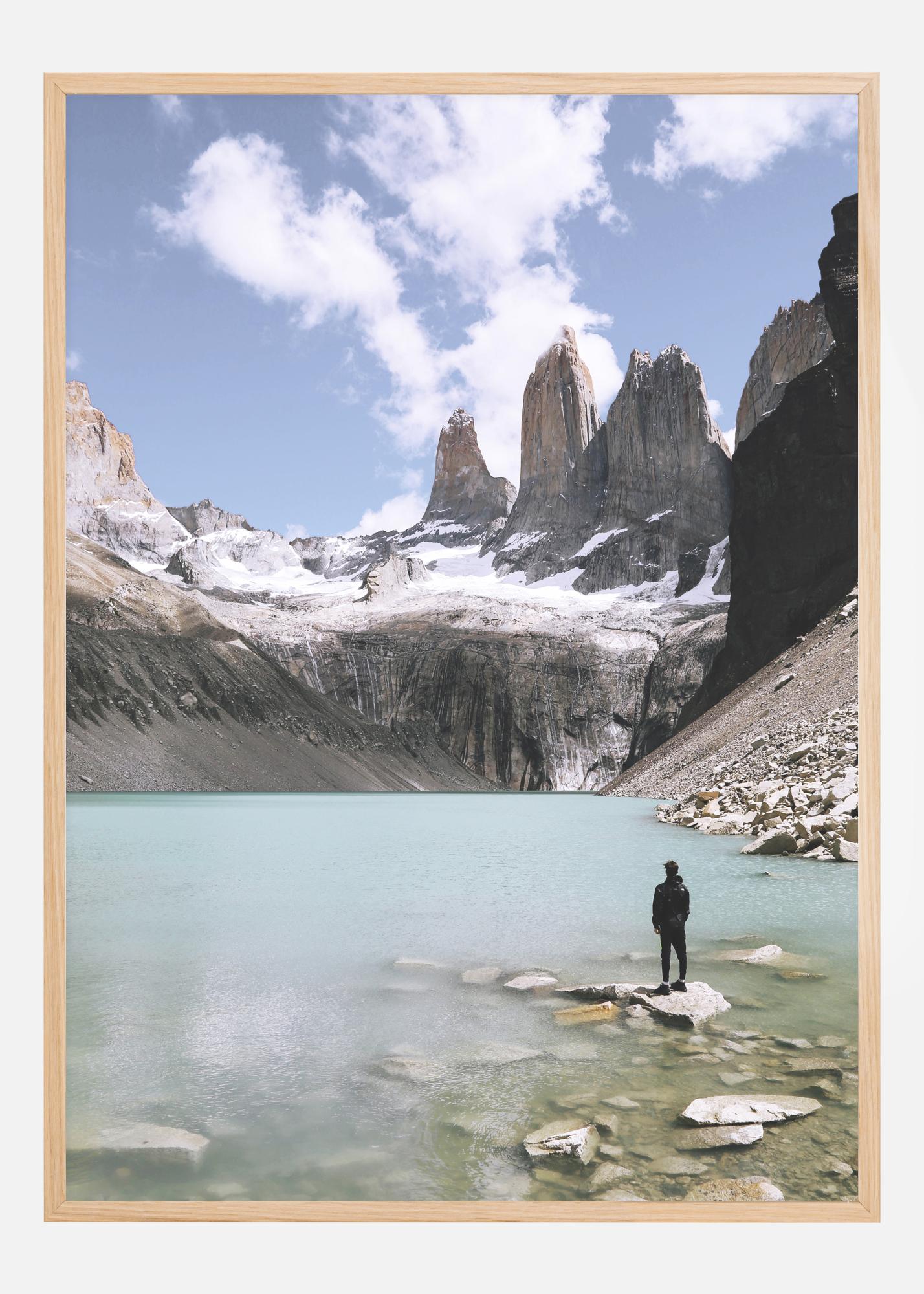 En naturposter med en ensam figur som observerar den hisnande omgivningen. Stående på en sten vid sjökanten omger de imponerande snöklädda bergen en turkosfärgad sjö. Du kan nästan känna den svala luften från den här magiska bilden.