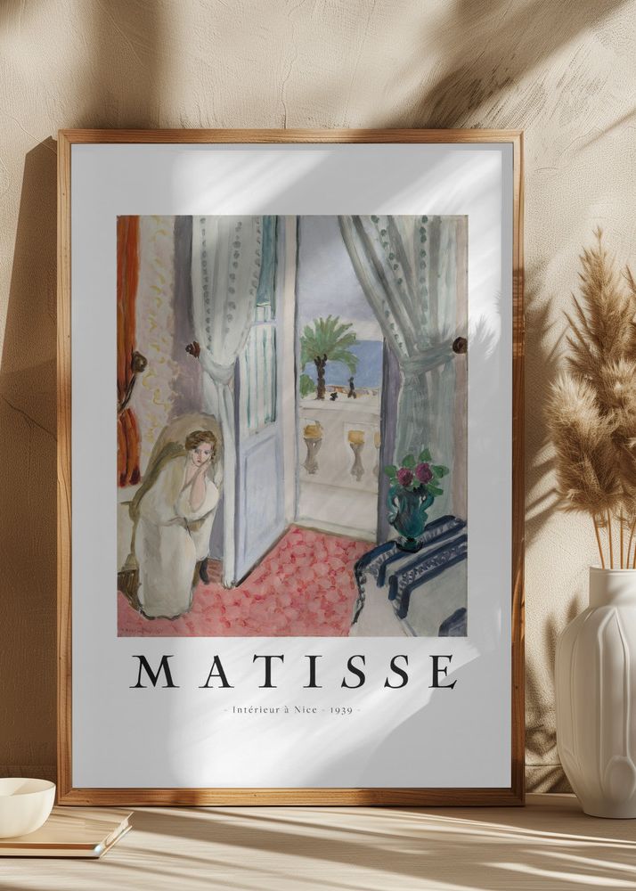 Motivet är rikt på detaljer, från de mönstrade gardinerna till den dekorativa mattan som går i rostrött. En kvinnogestalt syns i rummet, vilket tillför en personlig touch till denna konstnärliga print. Denna affisch är en perfekt detalj för alla som vill tillföra en touch av klassisk konst och färgglad estetik till sitt hem.