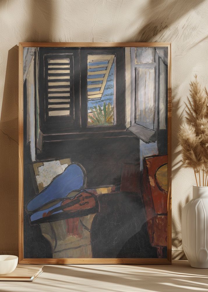 Denna poster erbjuder en fascinerande vy av ett interiör med fönster, där en kontrast mellan mörka och livfulla färger skapar en spännande och dramatisk effekt. Motivet skildrar ett rum med en öppning utåt där blått och beige syns genom fönsterspringorna, vilket ger en känsla av sommar och ljus. Den dämpade paletten i den inre delen av rummet, med dominerande svart och brunt, förstärker de livfulla accenterna i blått och orange, vilket ger bilden djup och dimension.