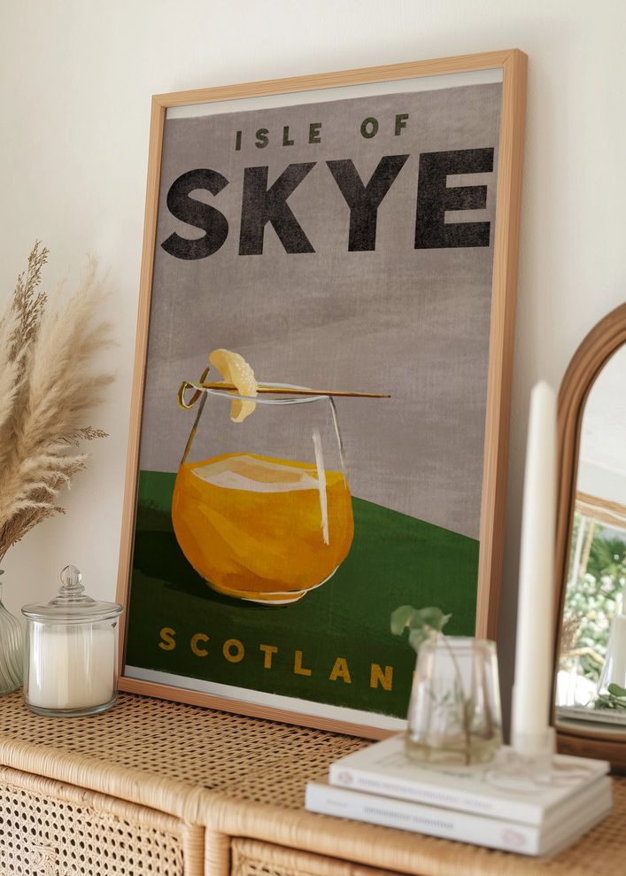 Denna stilrena poster fångar essensen av Isle of Skye med ett modernt och sofistikerat motiv. Framsidan pryds av ett elegant glas med en orange dryck och en citronskiva, vilket ger en fräsch och inbjudande känsla. Perfekt som en dekorativ print för köket eller barhörnan, ger den en känsla av både lyx och enkelhet.