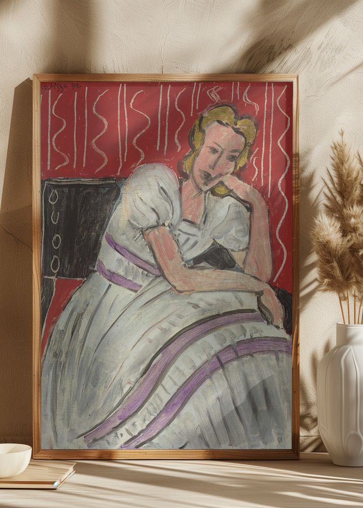 Denna vackra poster, inspirerad av klassisk konst, fångar ögat med sitt intensiva och levande uttryck. Bildens centrum pryds av en tankfull kvinna i en ljus klänning, som sitter mot en djärv röd bakgrund med böljande vita linjer. Varje penseldrag framhäver motivets elegans och karaktär, vilket gör denna print till ett konstverk som passar i vilket modernt hem som helst.