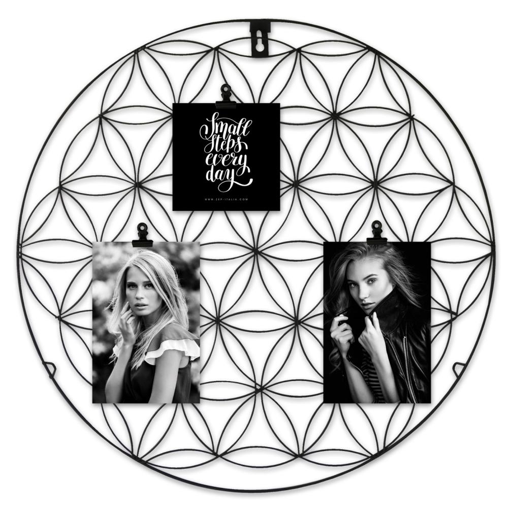 Detta är en häftig rund ram i svart metall. Collageramen mäter 50 cm Ø och bilder fästs med klämmor mot en bakgrund med dekorativt mönster. Eftersom du fäster bilderna med klämmor så kan du välja att fästa bilder i olika storlekar för att skapa en stilfull och lite dynamisk känsla. Den här runda collageramen i metall kan du snyggt placera i hemmet för ett vackert blickfång, eller ge bort som en fin gåva till någon!