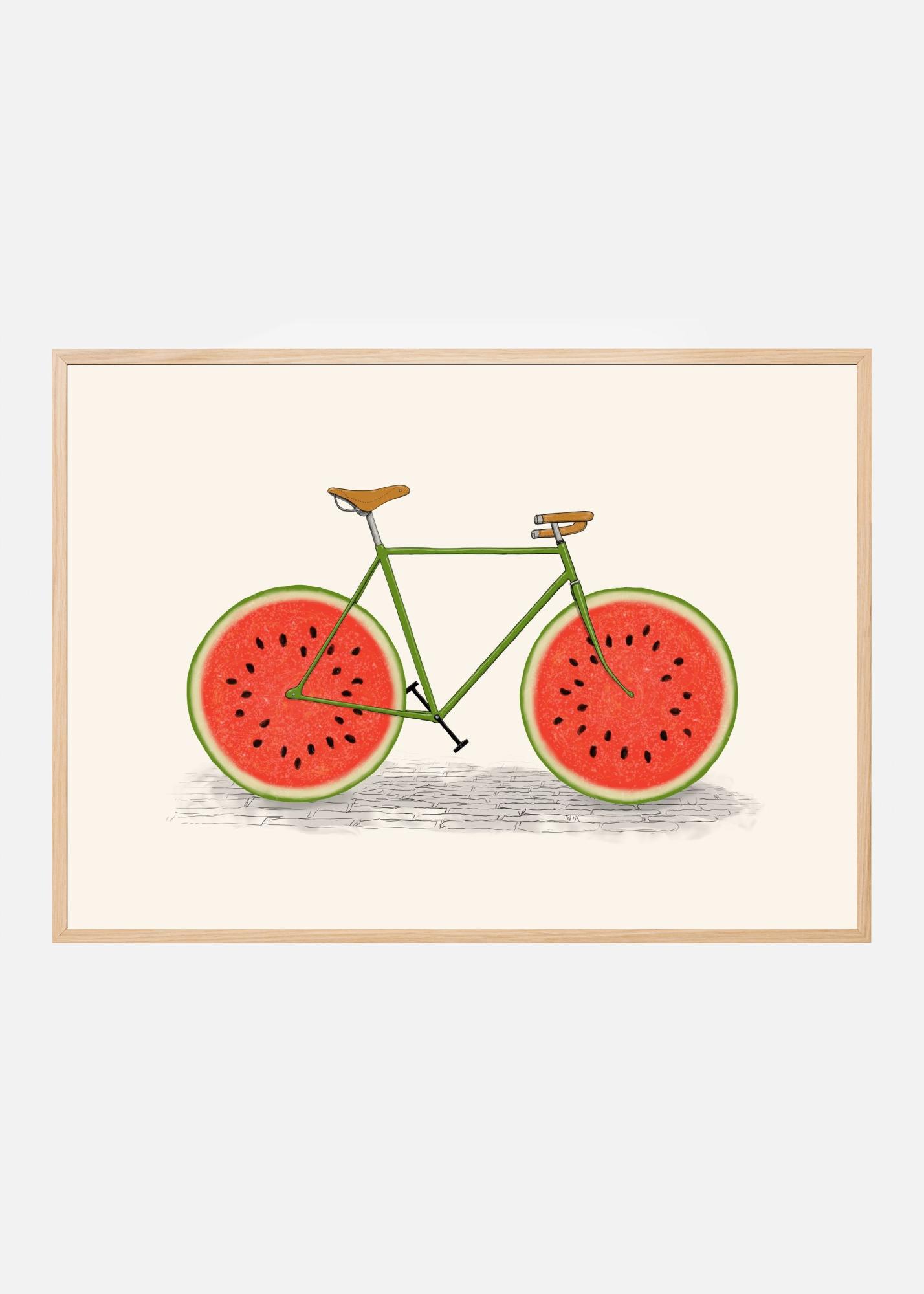 Gör ditt hem eller kontor mer personligt med denna uppfinningsrika affisch som kombinerar konst och humor. Dess detaljerade illustration får fram cykelns struktur med en enkel grå skugga på en vit bakgrund, vilket accentuerar de livliga färgerna och mönstret i de omisskännliga vattenmelonerna. Denna print är perfekt för de som älskar originella konstverk och vill ha något utöver det vanliga för att liva upp sin omgivning och skapa konversationsämnen bland vänner och besökare.