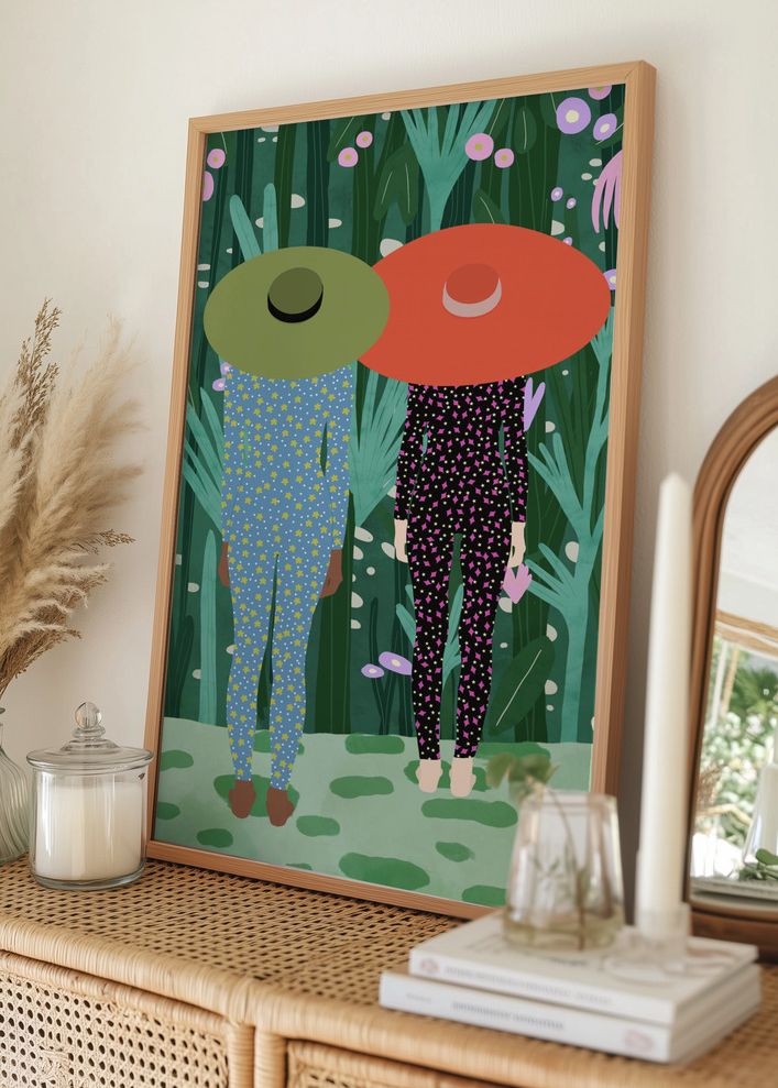 Den här färgsprakande postern fångar ögonblicket av två stilfulla personer i färgglada dräkter. Den vänstra bär en blå dräkt prydd med gula stjärnor och en stor, grön hatt. Den högra personen har en rosa-prickig dräkt mot en svart bakgrund tillsammans med en livfull, röd hatt. Tillsammans skapar dessa element en dynamisk kontrast mot den frodiga, gröna bakgrunden av blad och blommor.