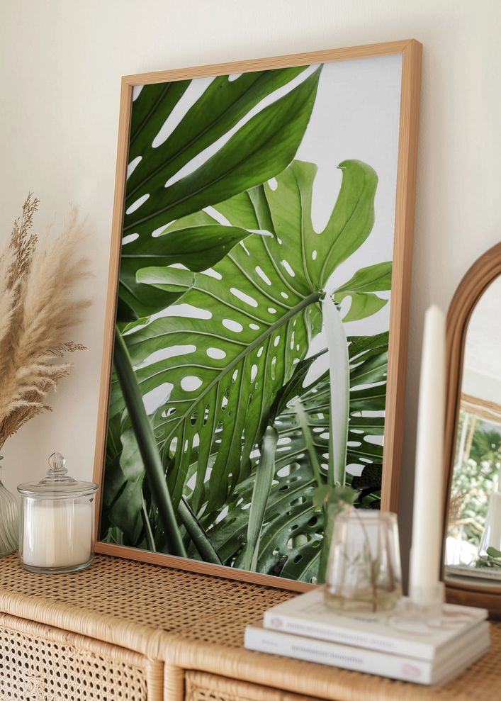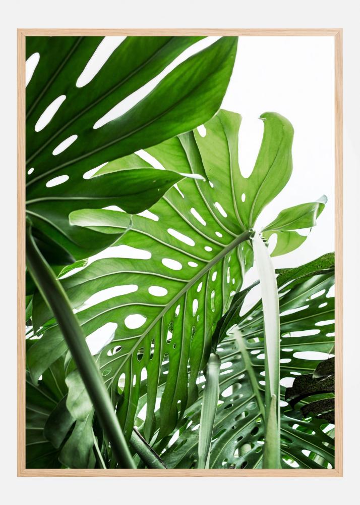 Denna vackra affisch fångar det frodiga gröna i tropiska blad, vilket ger en känsla av naturlig skönhet och lugn till ditt hem. De stora, perforerade bladen och deras djupa gröna nyanser skapar ett djärvt uttryck som passar perfekt för den moderna inredningen. Ljusinsläppet i bakgrunden ger en luftig och fräsch känsla till bilden, vilket gör denna poster till ett perfekt tillskott i ditt vardagsrum eller kontor.