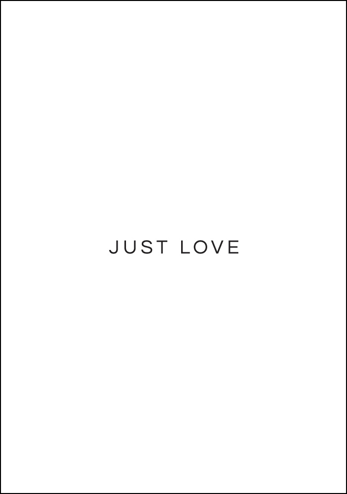 En svartvit motivationsposter som uttrycker två enkla ord. Bara kärlek. De två orden är skrivna i mitten på en vit sida och de är skrivna med svarta bokstäver, vilket ger ett enkelt men effektfullt budskap. En perfekt present att ge till din älskade.