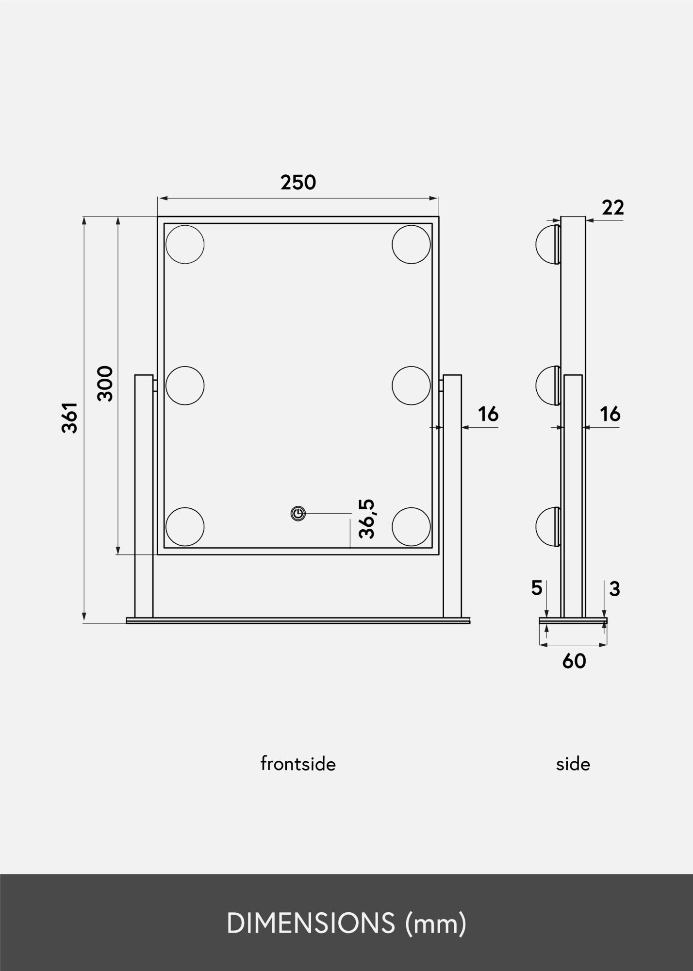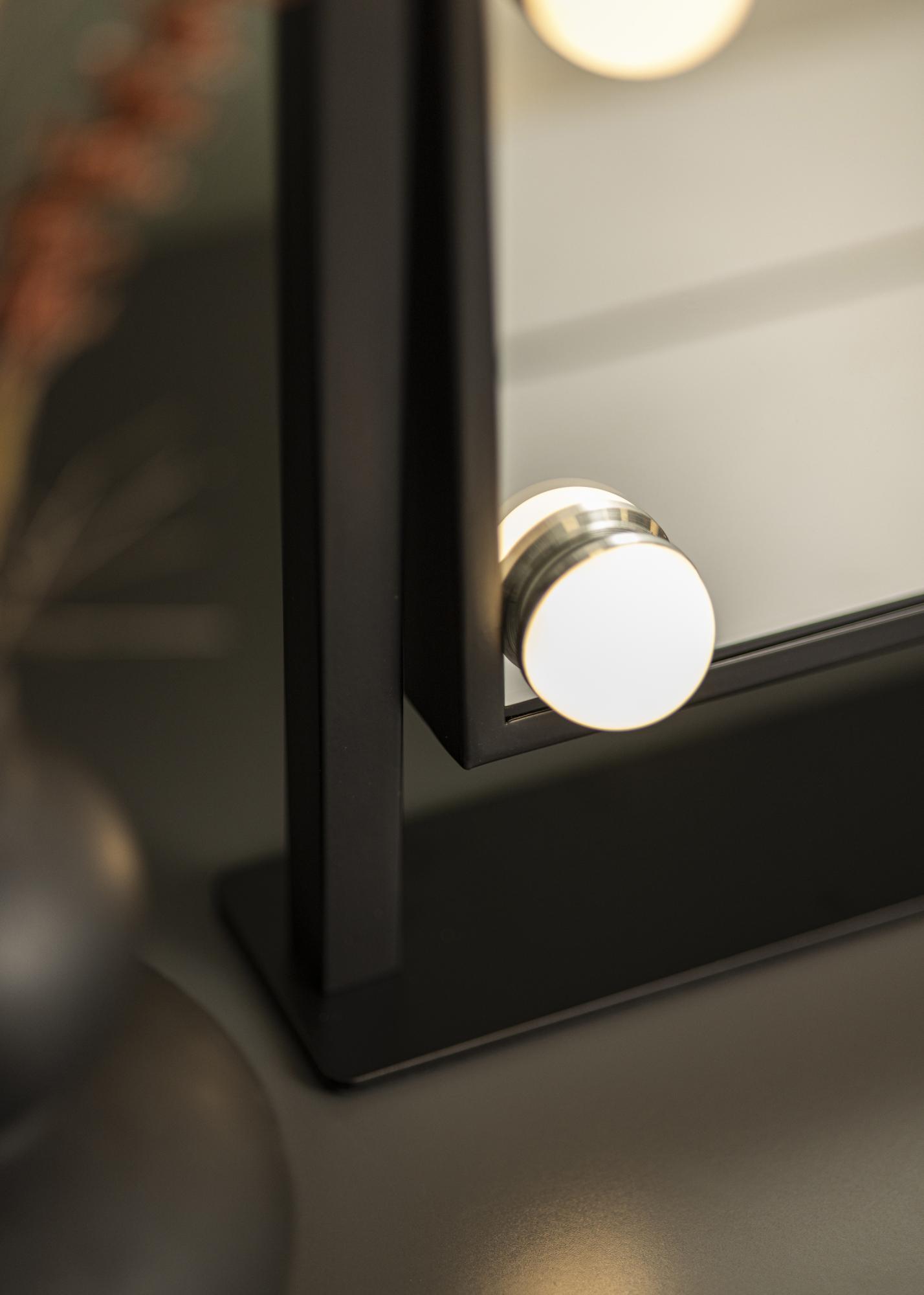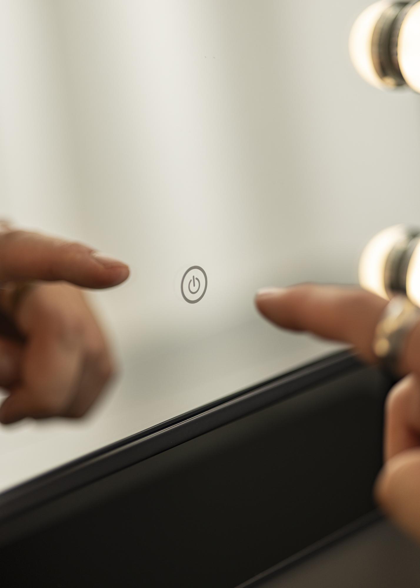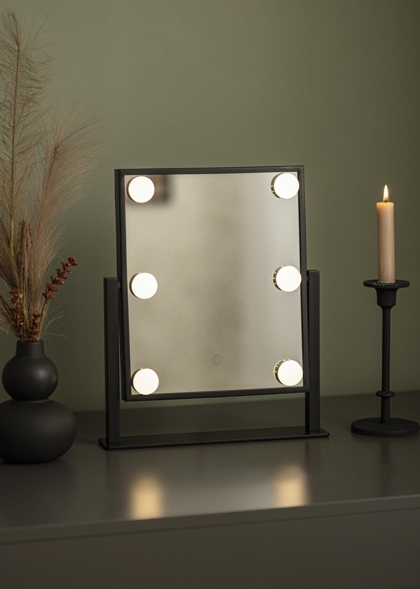 Detta är en riktigt lyxig sminkspegel med sex dekorativa och dimbara LED glödlampor i en trendig svart nyans. Belysningen ger ett varmt vitt sken i 3000K och tänds genom att trycka på touch-knappen. Justera lampornas styrka genom att hålla in knappen i några sekunder. LED är en ljuskälla som förbrukar mindre energi, har en längre livslängd och ger ett mer naturligt och jämnt ljus. Sminkspegeln går att vinkla så att du enkelt kan applicera din makeup med mer precision. Utöver dess många funktioner har denna sminkspegel en riktig Hollywood känsla över sig och blir en elegant detalj i hemmet!