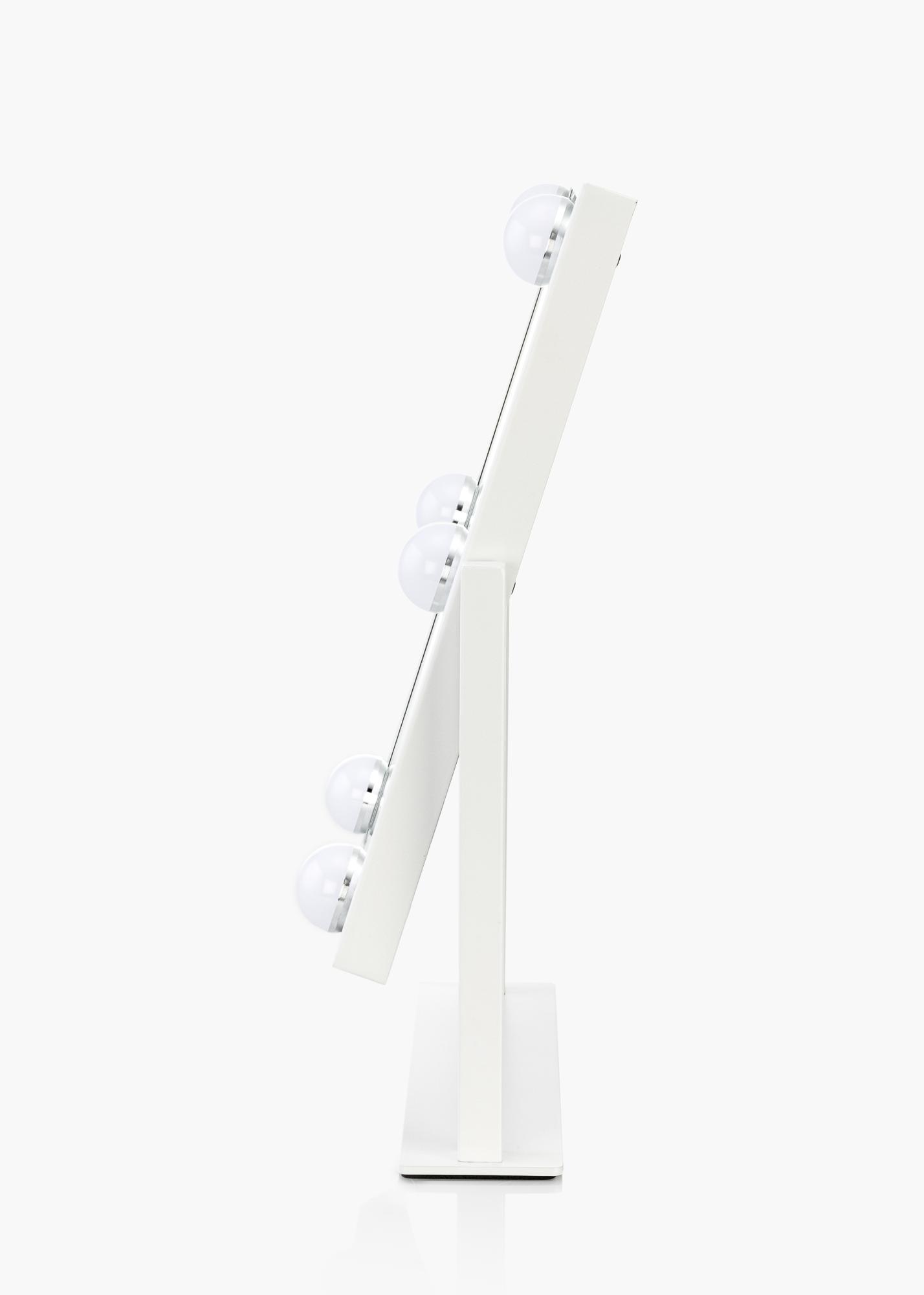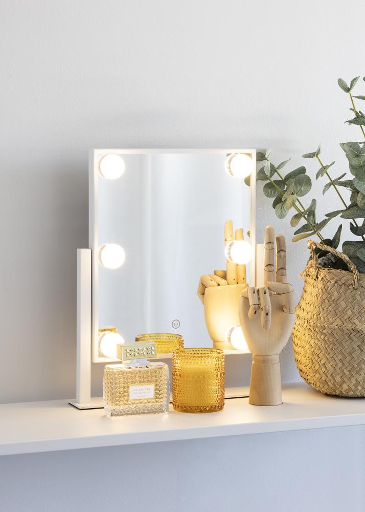 Detta är en riktigt lyxig sminkspegel med sex dekorativa och dimbara LED glödlampor i en vit stilfull nyans. Belysningen ger ett varmt vitt sken i 3000K och tänds genom att trycka på touch-knappen. Justera lampornas styrka genom att hålla in touch knappen i några sekunder. LED är en ljuskälla som förbrukar mindre energi, har en längre livslängd och ger ett mer naturligt och jämnt ljus. Sminkspegeln går att vinkla så att du enkelt kan applicera din makeup med mer precision. Utöver dess många funktioner har denna sminkspegel en riktig Hollywood känsla över sig och blir en elegant detalj i hemmet!
