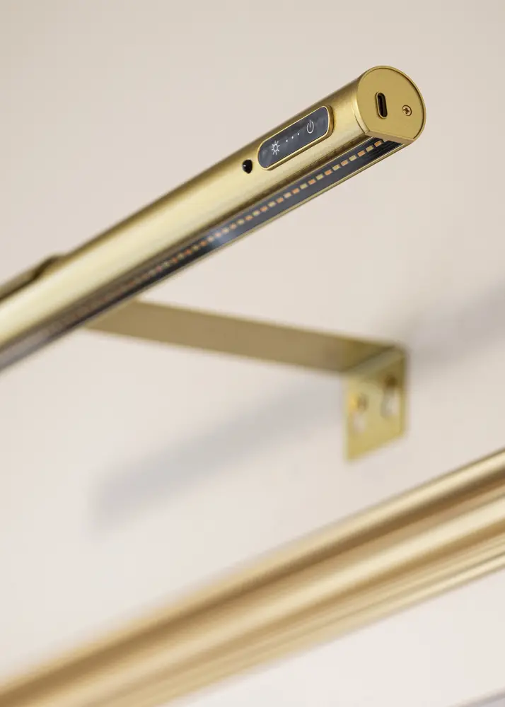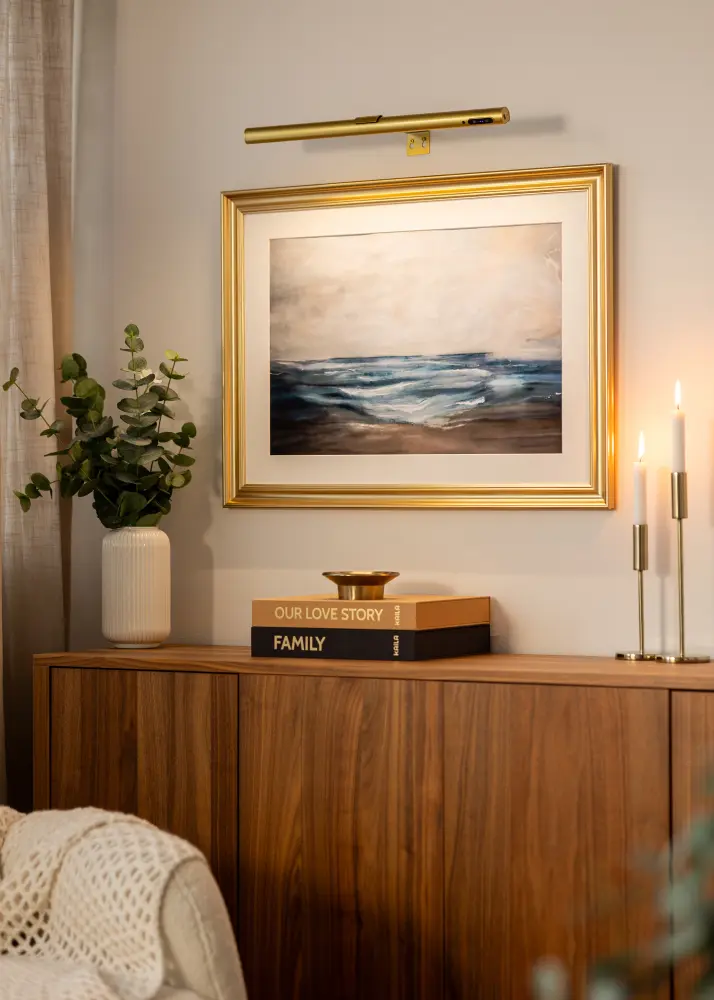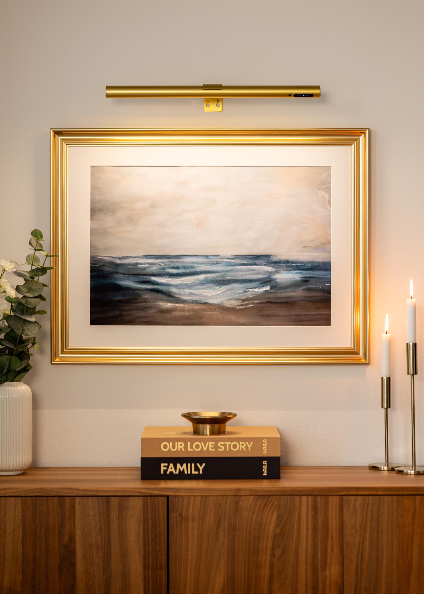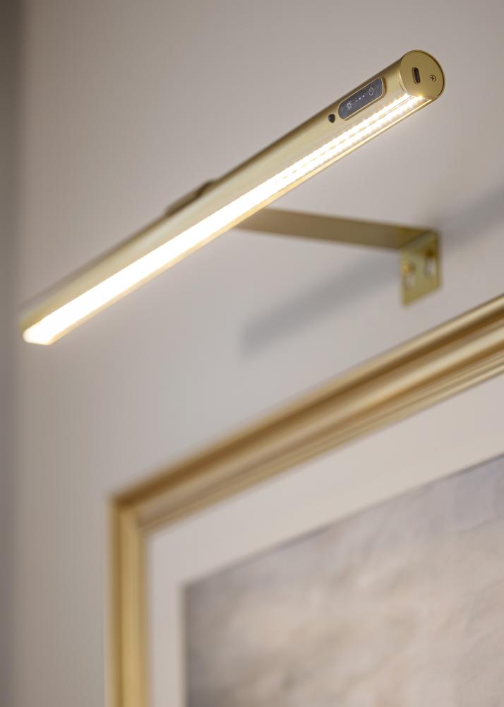 KAILA Halo är en stilren och batteridriven tavelbelysning i guld, perfekt för att belysa dina konstverk utan störande sladdar. Tack vare den sladdlösa designen kan du placera den var som helst utan att behöva ta hänsyn till eluttag. Den eleganta guldfinishen ger ett exklusivt uttryck, medan ljuset sprids jämnt för att framhäva detaljer och färger på ett vackert sätt. Enkel att montera och smidig att använda – en praktisk lösning för att ge dina tavlor den uppmärksamhet de förtjänar.
