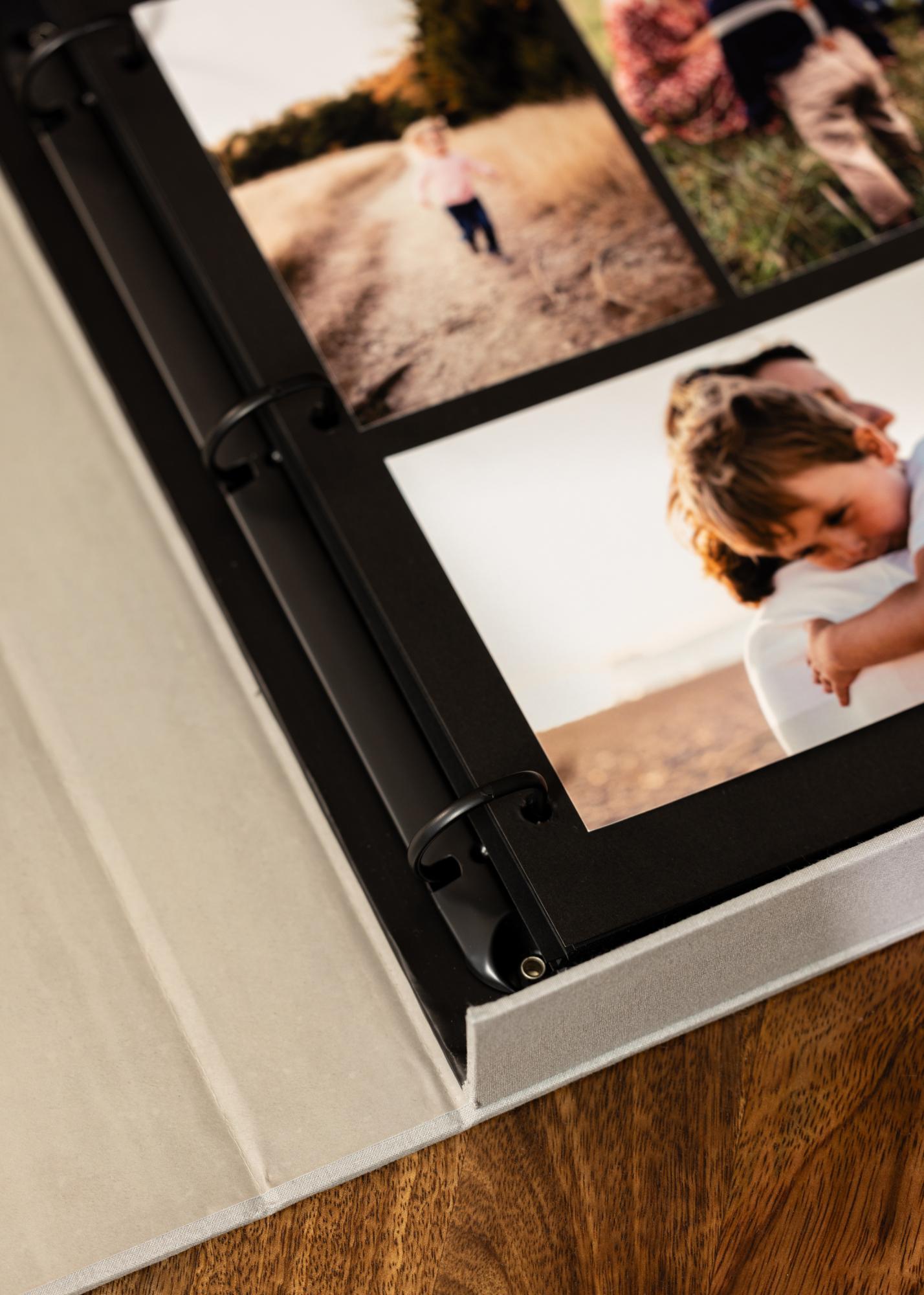 Fotoalbumet är utformat som en exklusiv ask du öppnar upp för att komma åt innehållet. Inuti albumet möts du av en ringpärm och 30 svarta blad (60 sidor) att fylla med dina favoritminnen. Du klistrar själv in dina foton vilket ger dig stor flexibilitet och möjligheten att plocka fram din kreativa sida.