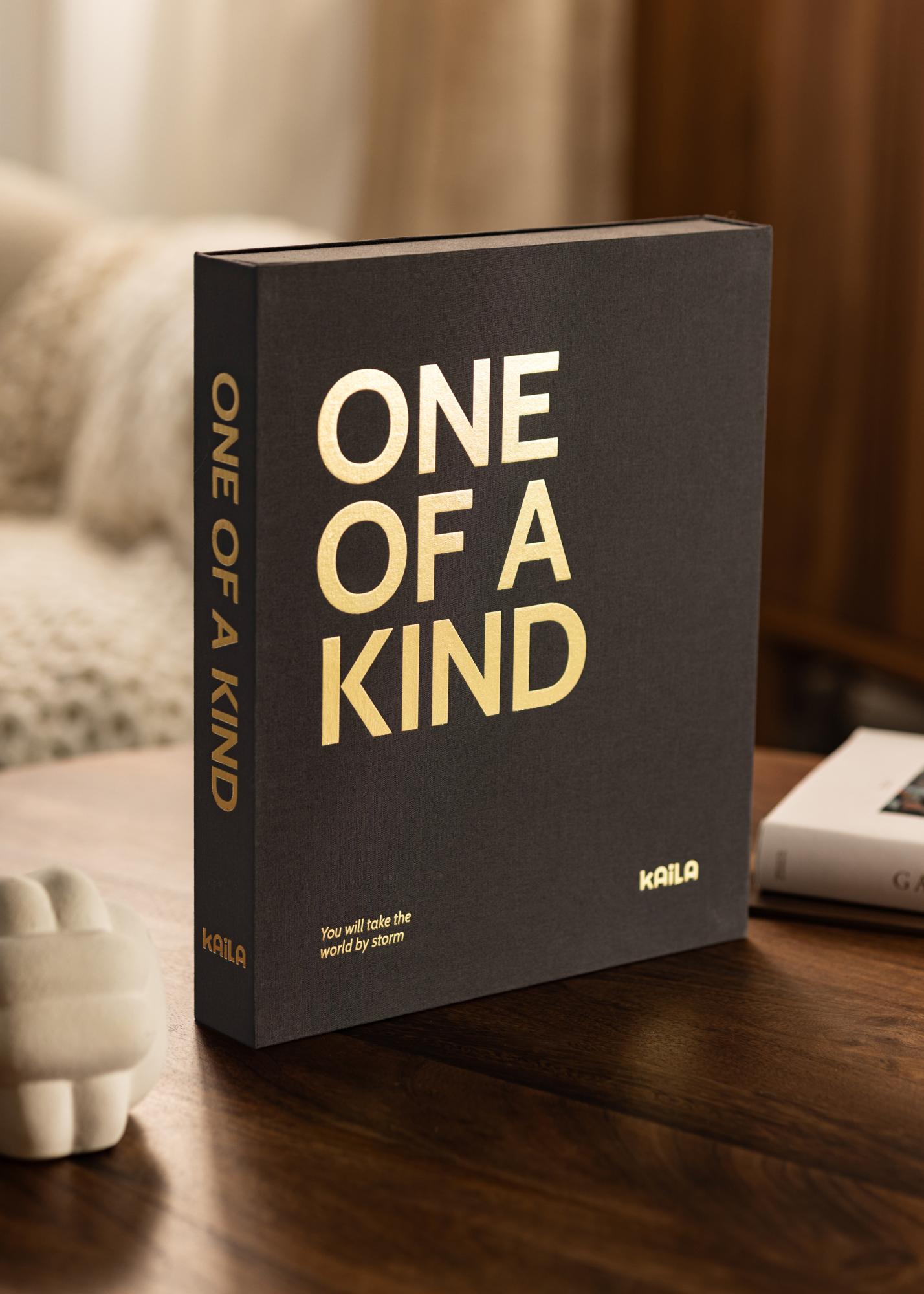 Framkalla dina bilder och förvara dem i ett fint Coffee Table Photo Album! Detta fotoalbum från KAILA är klätt i svart textil och är utformat som en lyxig ask vilket verkligen ger det en exklusiv känsla. Det bästa är att detta fotoalbum är lika snyggt som en inredningsdetalj! På fotoalbumets framsida är titeln ”ONE OF A KIND” tryckt i stora vita bokstäver och undertexten ”You will take the world by storm” vilket gör detta album perfekt för fina bilder från barndomen eller för att ge bort till någon speciell, eller såklart för dina egna härliga fotominnen.