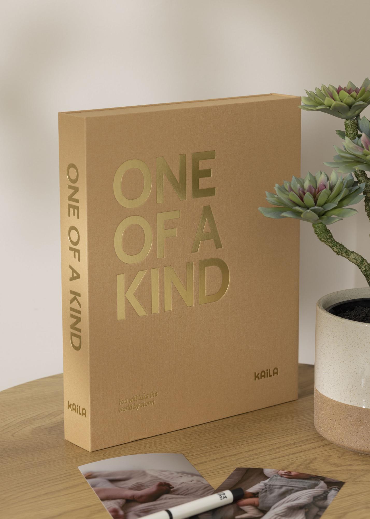 Framkalla dina bilder och förvara dem i ett fint Coffee Table Photo Album! Detta fotoalbum från KAILA är klätt i manillafärgad textil och är utformat som en lyxig ask vilket verkligen ger det en exklusiv känsla. Det bästa är att detta fotoalbum är lika snyggt som en inredningsdetalj! På fotoalbumets framsida är titeln ”ONE OF A KIND” tryckt i stora vita bokstäver och undertexten ”You will take world by storm” vilket gör detta album perfekt för fina bilder från barndomen eller för att ge bort till någon speciell, eller såklart för dina egna härliga fotominnen.