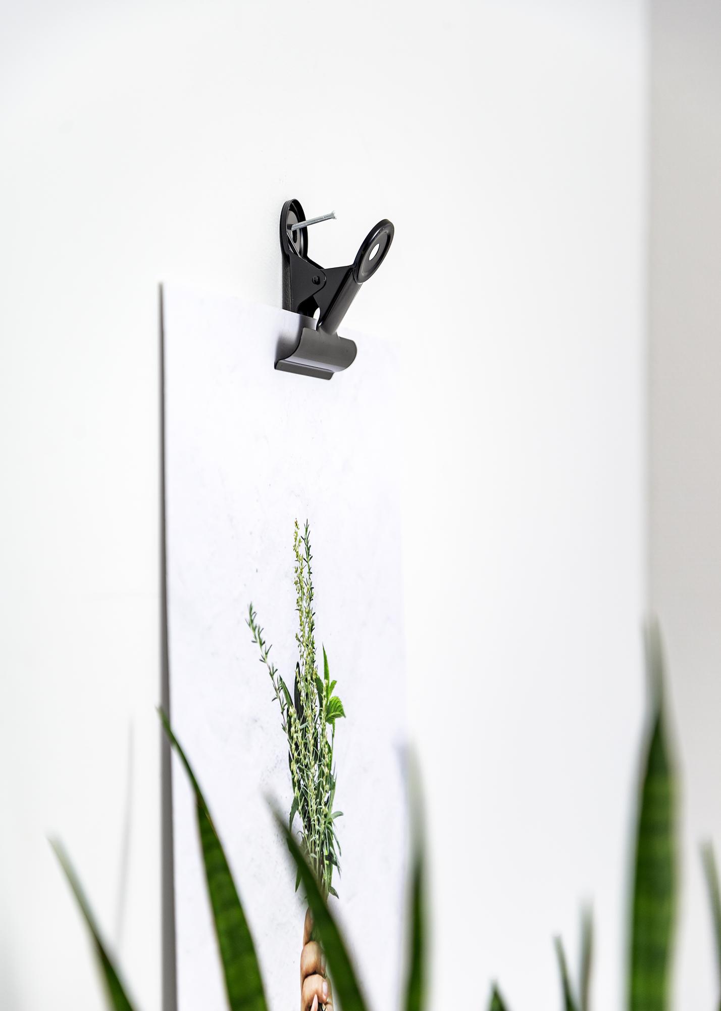 Denna svarta metallklämma har en snygg matt finish och ger du dina posters och prints en chic och trendig upphängning. Klämmans öppning har ett rejält grepp som gör att du kan fästa det allra tunnaste av papper, samtidigt som det även går bra att använda den till motiv med lite större tjocklek. Har du en stor poster som du vill hänga upp kan du välja att använda två posterklämmor. Metallklämmans design är stilren, och hålen i klämmans runda topp gör det enkelt och smidigt att hänga den på väggen med en liten spik eller skruv.