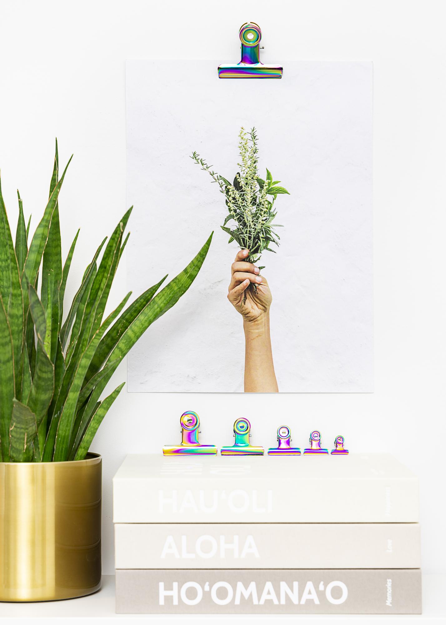 En läckert regnbågsfärgad metallklämma i en blank finish som ger dina posters och prints en trendig och lite annorlunda upphängning. Posterklämmans kraftiga, men flexibla, öppning gör att du kan fästa det allra tunnaste pappret såväl som posters med lite rejälare tjocklek. Och har du en stor poster som du vill hänga upp är det bara att använda två metallklämmor. Posterklämmans design är stilren och avskalad, och tack vare hålen i klämmans runda topp sätter du enkelt upp den på väggen med hjälp av en liten spik eller skruv.