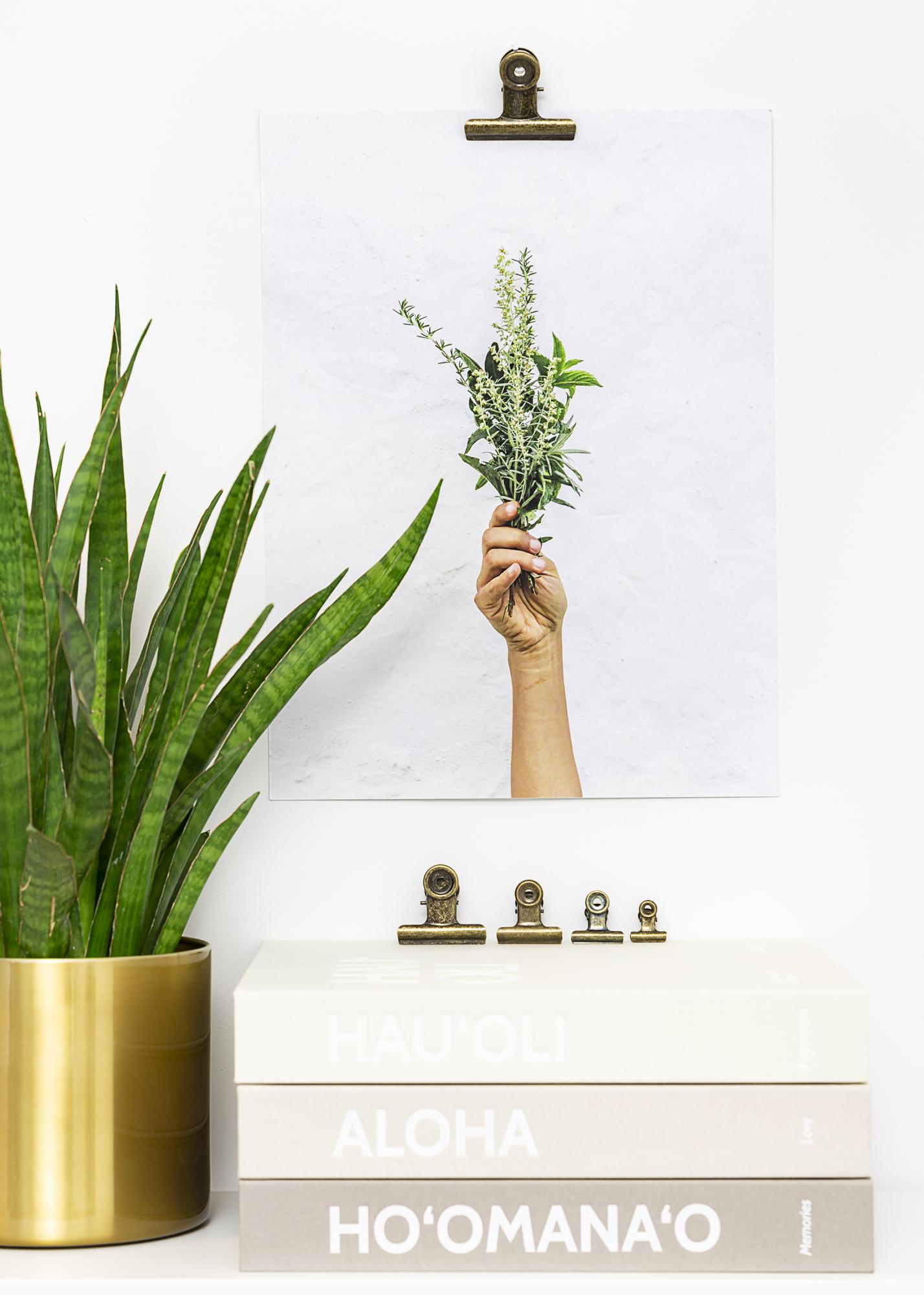 Denna stilfulla metallklämma ger dig ett enkelt och modernt sätt att hänga upp posters och prints på väggen, samtidigt som den vackert nötta bronsfärgen även kan tilltala dig som gillar inredningsdetaljer i rustik stil. Klämmans öppning har ett rejält men flexibelt grepp som gör att du kan fästa både supertunna papper och posters med lite kraftigare tjocklek. Har du en poster i ett lite större format som du vill hänga upp kan du bara använda två metallklämmor. Monteringen på din vägg sker enkelt tack vare hålen i posterklämmans stilfullt runda topp.