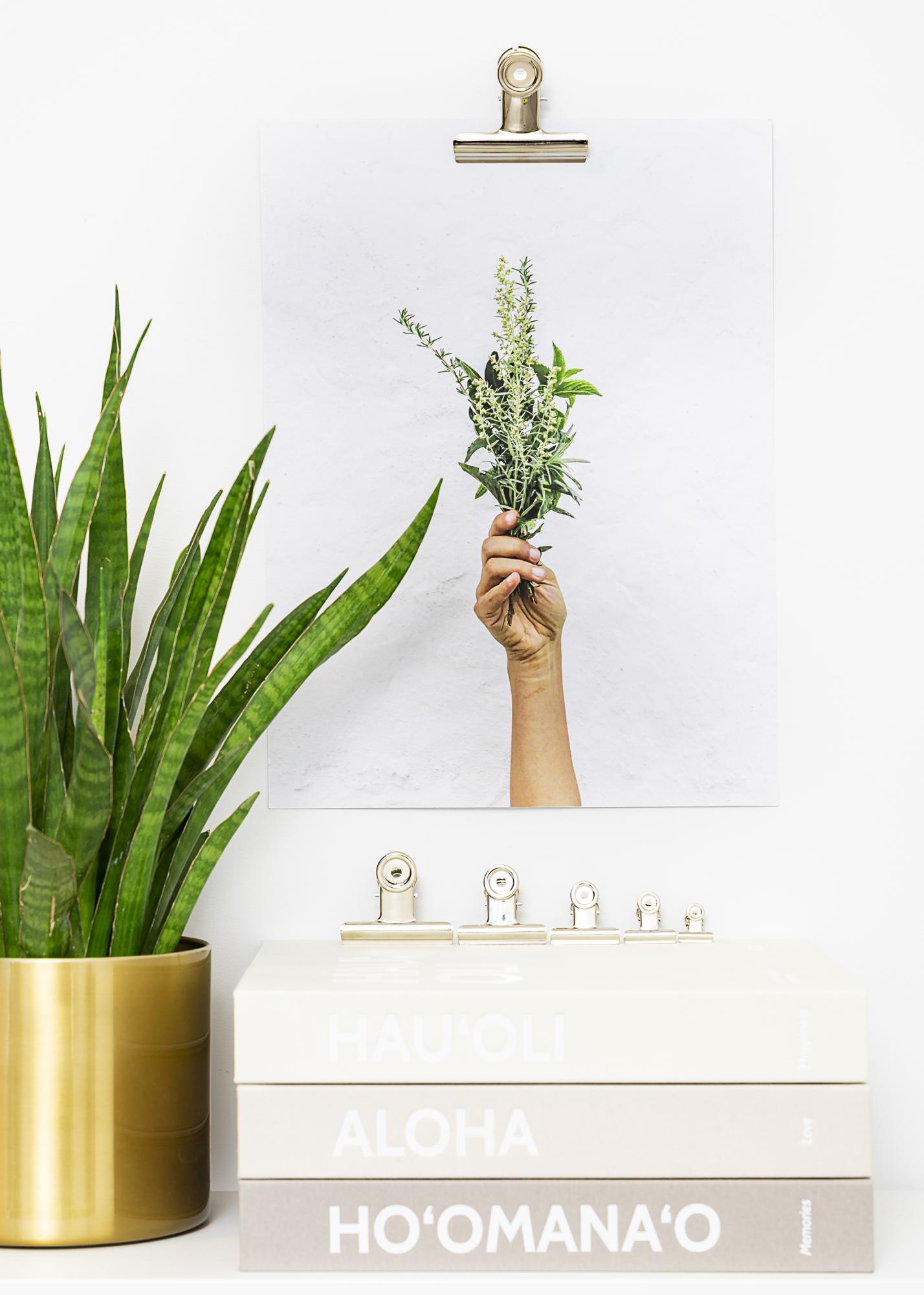 Denna metallklämma har en modern och blank silverfinish och är det perfekta verktyget för att skapa en trendig och minimalistisk upphängning av posters eller prints. Klämmans flexibla och ordentliga öppningsgrepp gör att du kan hänga upp motiv med en varierande tjocklek, även det allra tunnaste av papper. Och om du har en stor poster använder du bara två metallklämmor. Posterklämmans design är avskalad och stilren, och hålen i klämmans runda topp gör monteringen på väggen enkel och smidig – allt du behöver är en liten spik eller skruv.