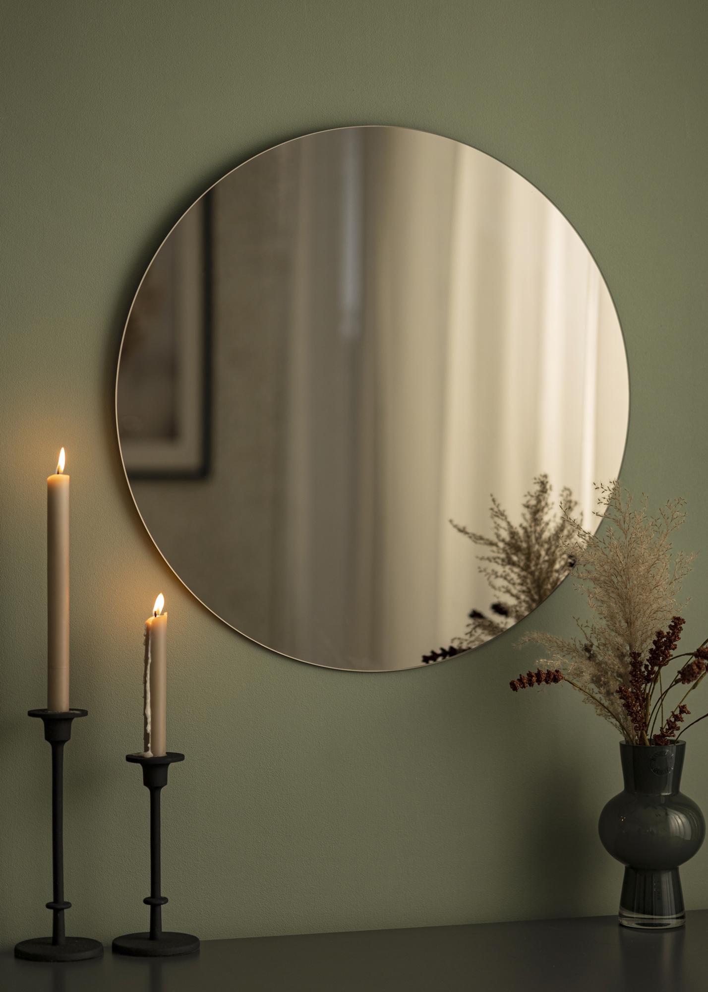 Denna runda spegel har tunn design utan ram, vilket ger ett elegant och exklusivt utseende som lyfter varje rum. Med spegelglas i en bronsfärgad nyans har väggspegeln en mustig och hemtrevlig framtoning som passar perfekt i moderna hem. Spegeln ingår i en serie runda, bronsfärgade speglar från KAILA och du kan välja mellan sju olika storlekar för att hitta den som passar ditt hem bäst. Denna modell har en diameter som mäter 60 cm. Du kan enkelt hänga upp spegeln i hallen eller vardagsrummet med hjälp av väggfästet.