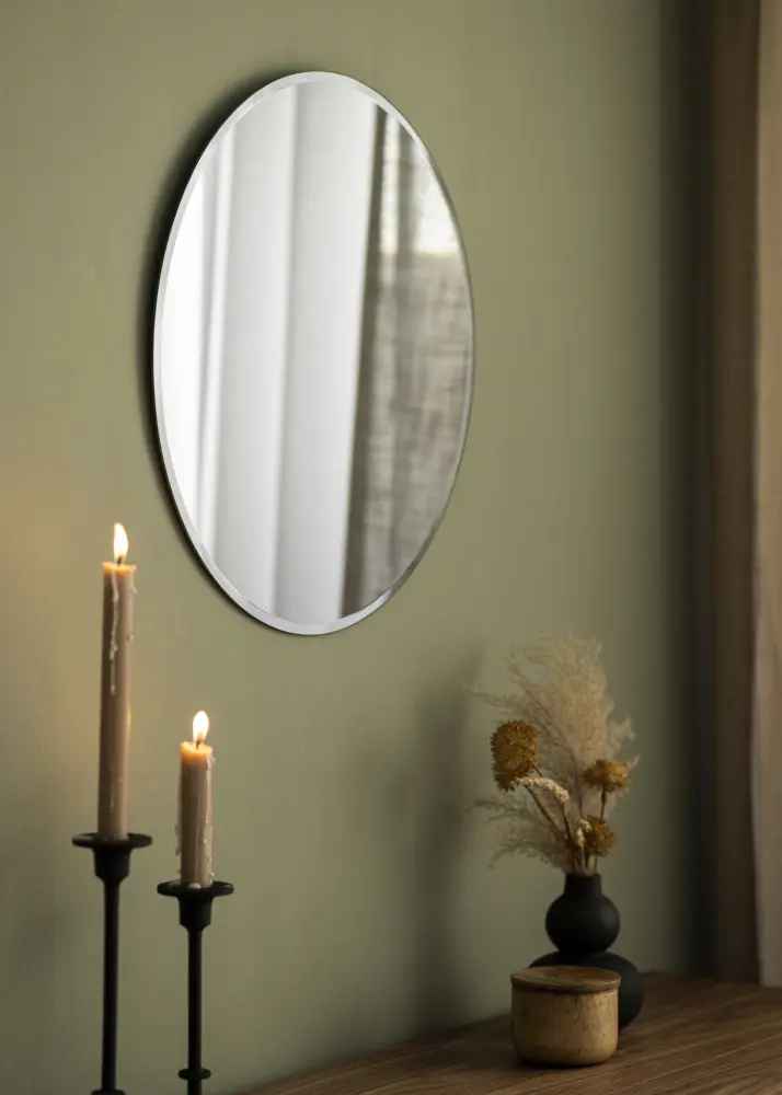 Den eleganta känslan som spegelns form och kulör förmedlar förstärkts av att spegeln inte har någon ram. Istället pryds kanterna av en prydlig fasettkant, som ger spegeln det lilla extra.