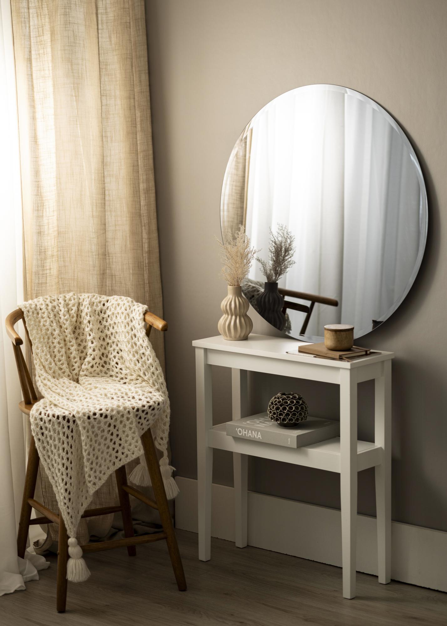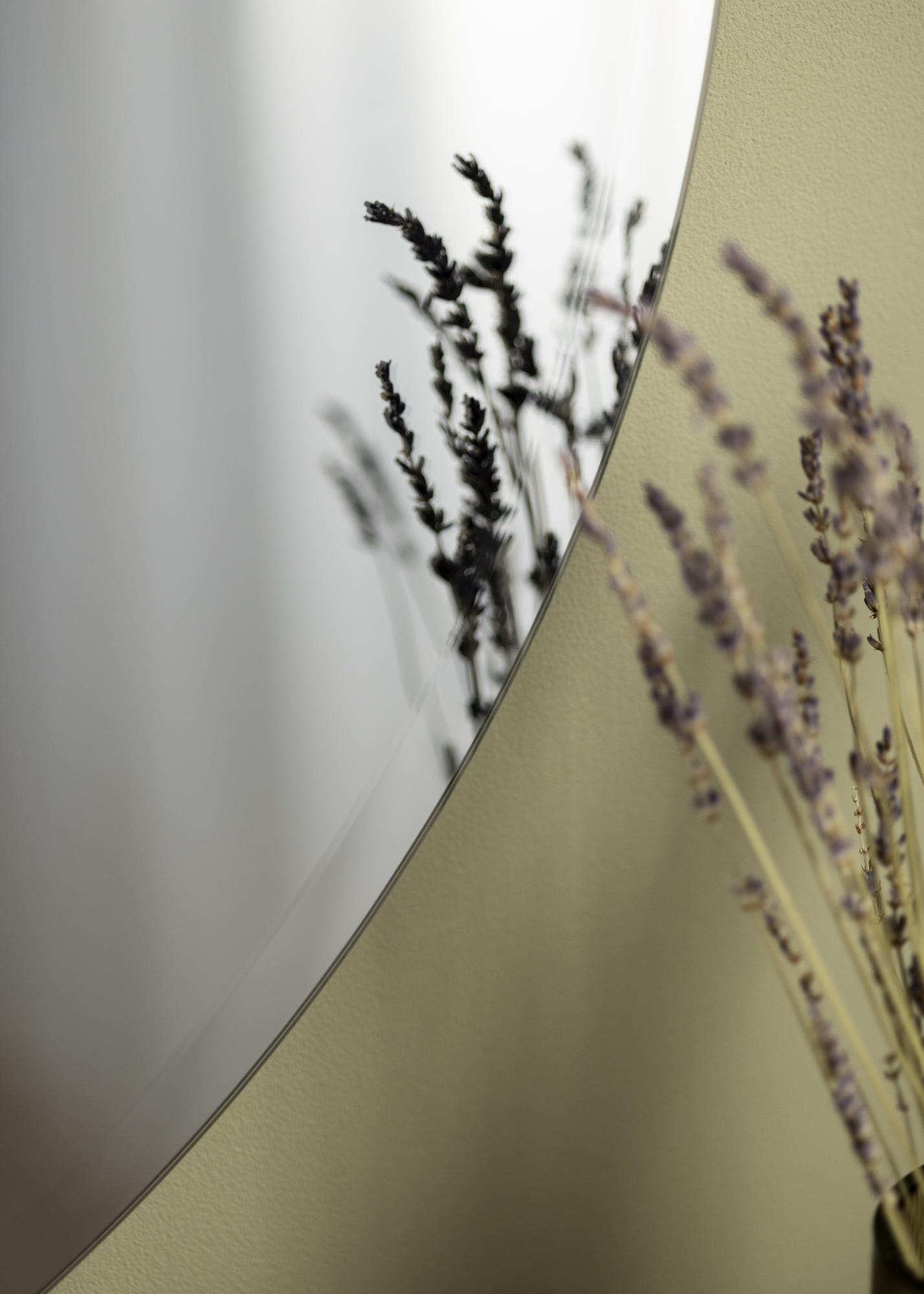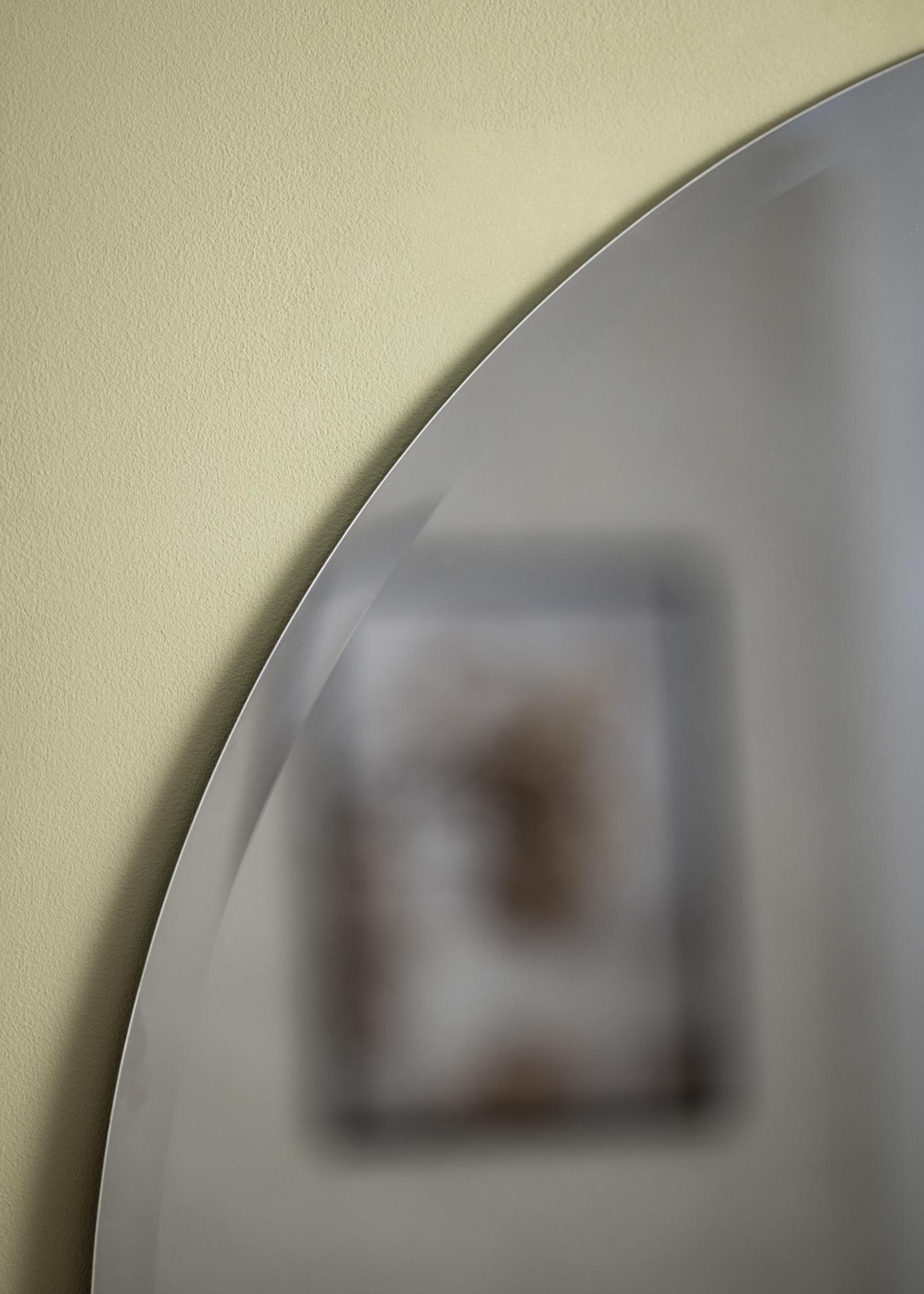 Den eleganta känslan som spegelns form och kulör förmedlar förstärkts av att spegeln inte har någon ram. Istället pryds kanterna av en prydlig fasettkant, som ger spegeln det lilla extra.