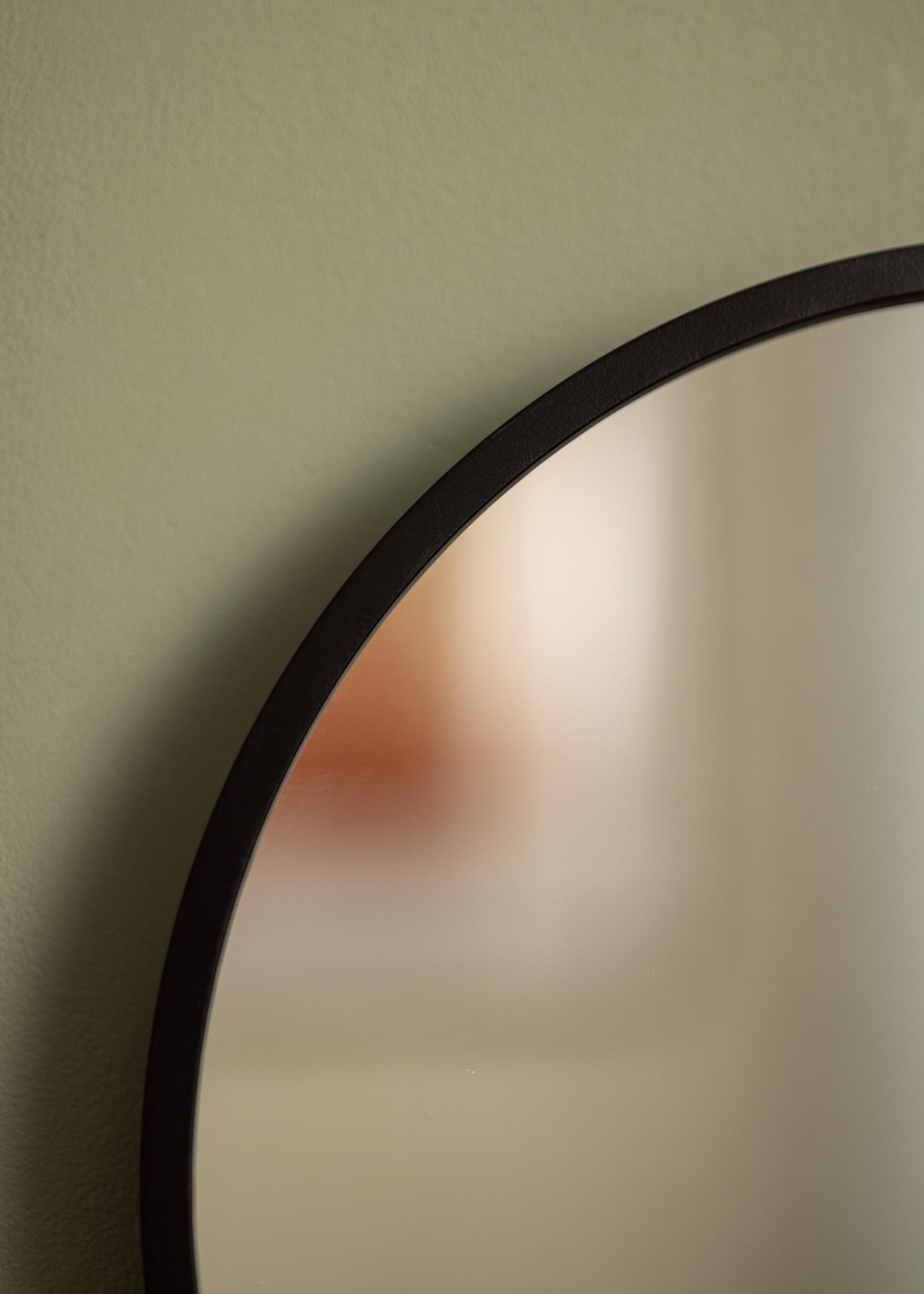 KAILA Round Mirror Edge Black är en rund spegel med en stilren tunn metallram färgad i matt svart, vilket ger den en industriell och trendig framtoning. Ramen har – beroende på storlek – ett djup på mellan 30-40 mm, vilket gör att spegelglaset kommer ut en bit från väggen och skapar en häftig 3D-effekt. Ramens djup gör också att spegeln känns gedigen samtidigt som den behåller sin minimalistiska framtoning. En perfekt rund spegel att placera i vilket rum som helst där du vill addera funktion och stilren svensk design!