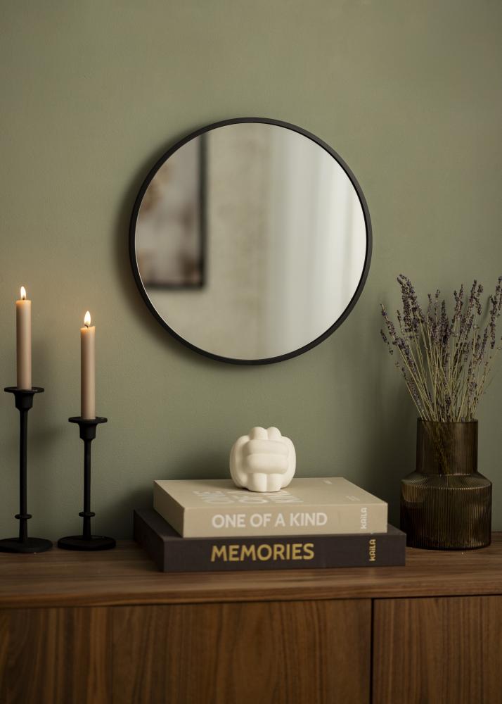 KAILA Round Mirror Edge Black är en rund spegel med en stilren tunn metallram färgad i matt svart, vilket ger den en industriell och trendig framtoning. Ramen har – beroende på storlek – ett djup på mellan 30-40 mm, vilket gör att spegelglaset kommer ut en bit från väggen och skapar en häftig 3D-effekt. Ramens djup gör också att spegeln känns gedigen samtidigt som den behåller sin minimalistiska framtoning. En perfekt rund spegel att placera i vilket rum som helst där du vill addera funktion och stilren svensk design!